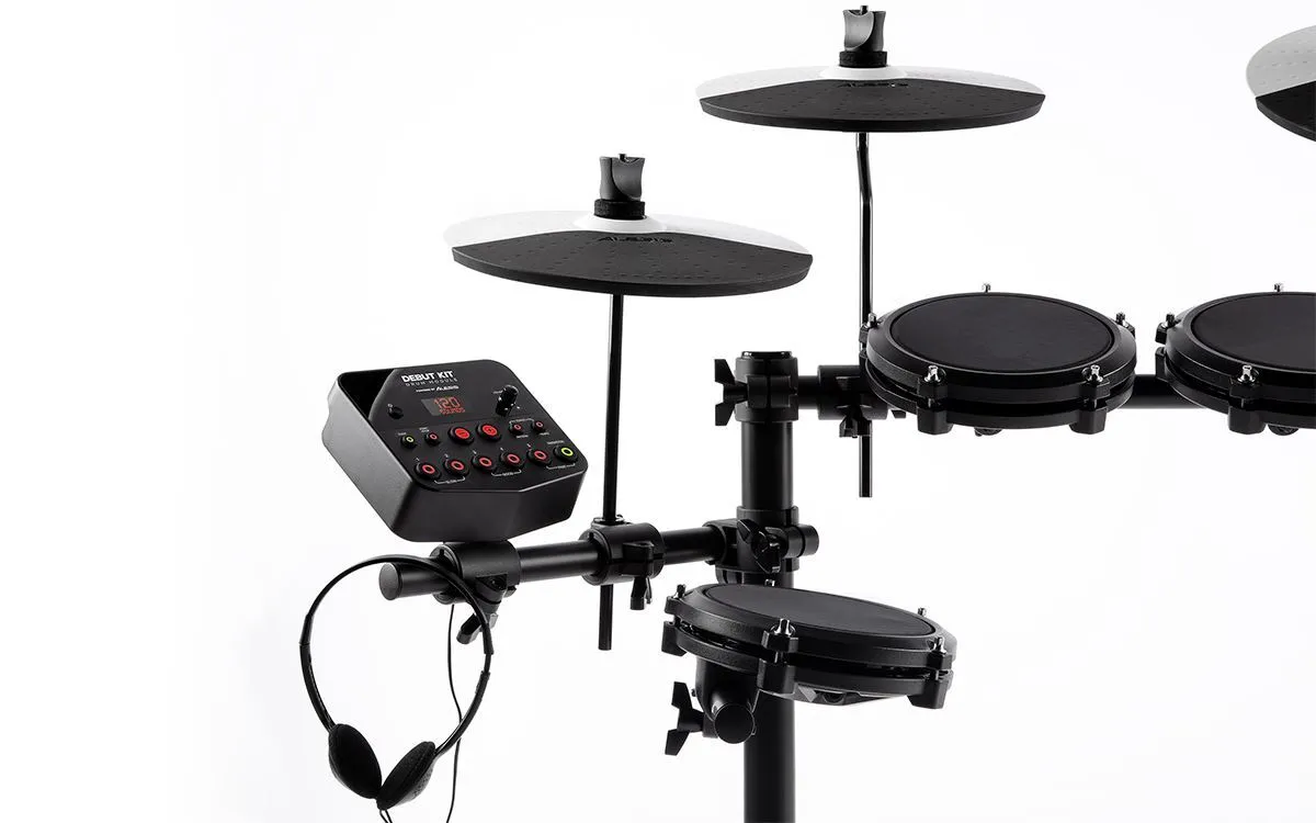 Playing drums has never been more accessible! Introducing the Debut Kit by Alesis, a complete electronic drumming system in one box. This is no toy – the Debut Kit comes with absolutely everything you need to start drumming right away. First, there are the drums themselves - (4) 6” adjustable mesh-head drums that feel great without any of the noise that comes with rubber e-drum pads. Each one of the (3) included cymbals boasts a large 10” playing surface so you never miss a beat. The Kick drum and Hi-Hat are controlled by responsive foot pedals that can be rolled up and put away while not in use and the adjustable drum throne and headphones provide comfort for players of all ages. Did we mention that drumsticks are included too? The Debut Kit is the perfect package for any aspiring drummer.