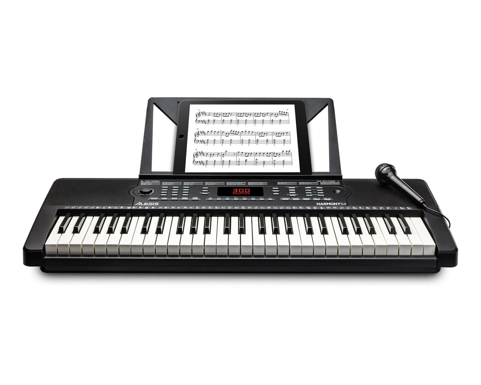 Learning to play the keys just got a whole lot easier! The Alesis Harmony 54 keyboard combines 54 piano-style keys, built-in speakers, 300 built-in sounds with layering and split modes, 300 built-in rhythms for playing along, 40 demo songs, a headphone input that automatically mutes the speakers for private practice, a music rest for holding sheet music or a tablet, a power adapter and even a microphone for singing along while you play.