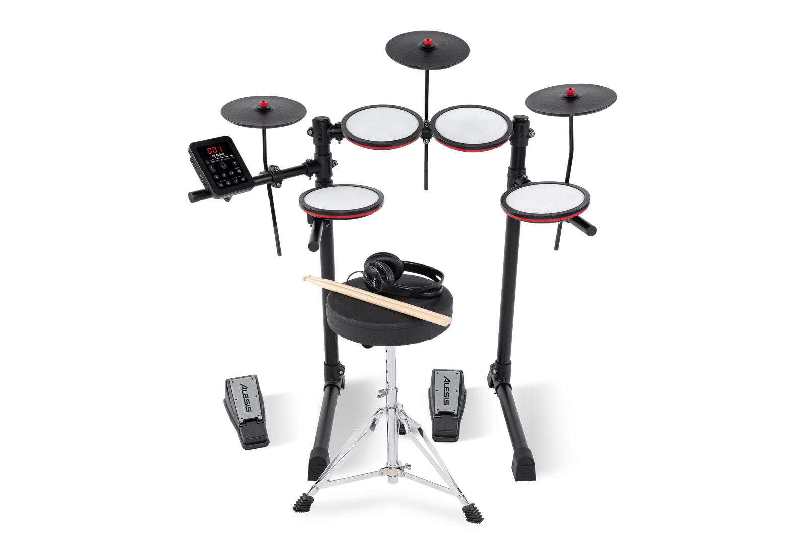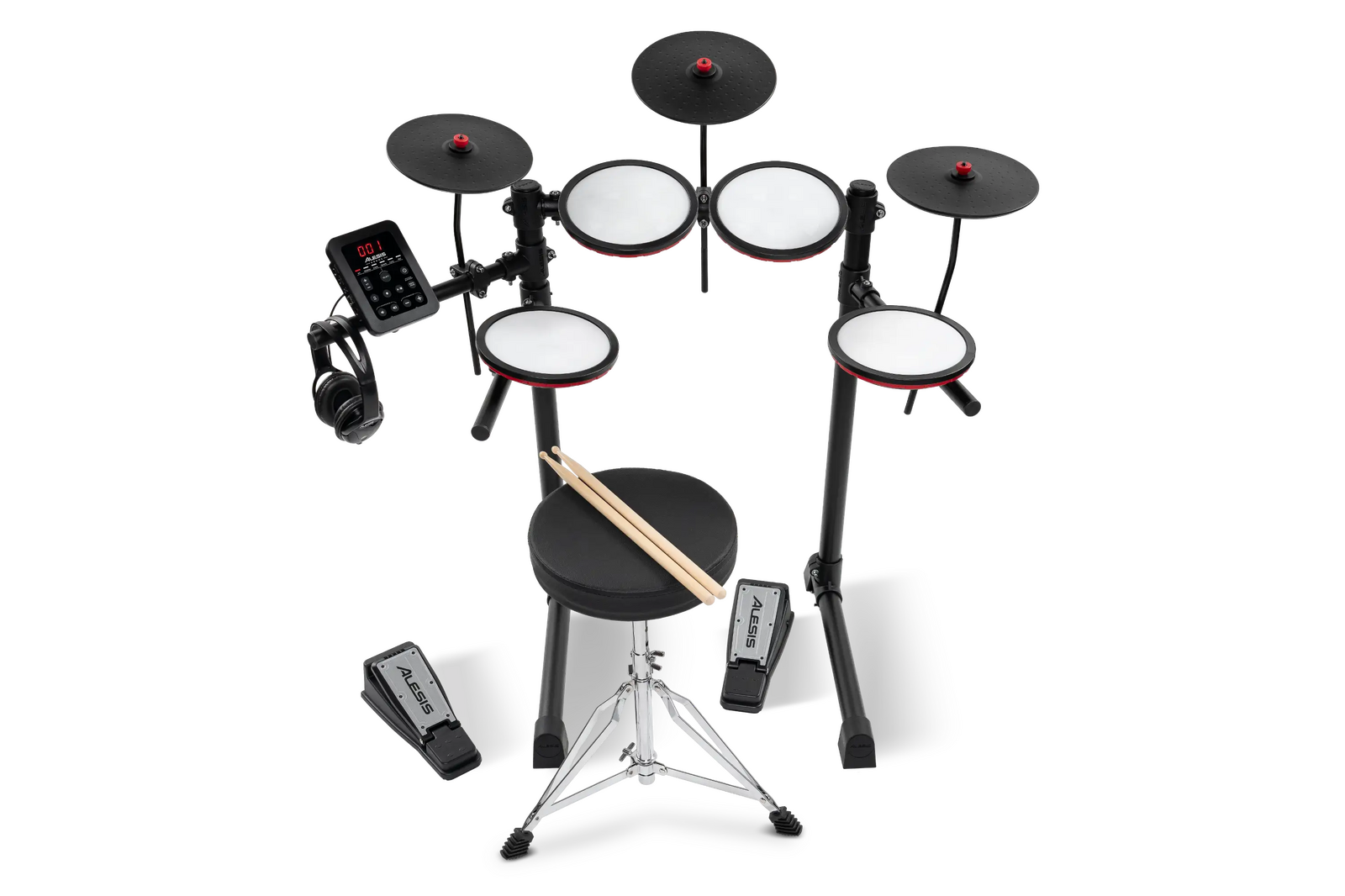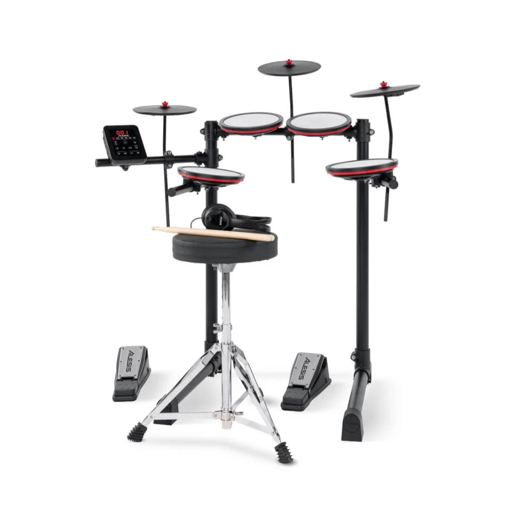 The Alesis Turbo Max is an all–in–one 7–piece electronic drum kit designed for beginners and hobbyists alike. Compact and approachable, it includes everything needed to start playing straight away — from mesh pads and pedals to a drum throne, sticks, headphones, and the feature–packed Turbo Max sound module.