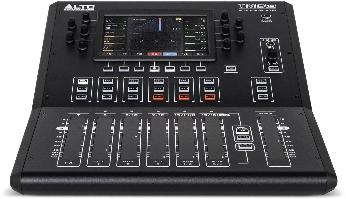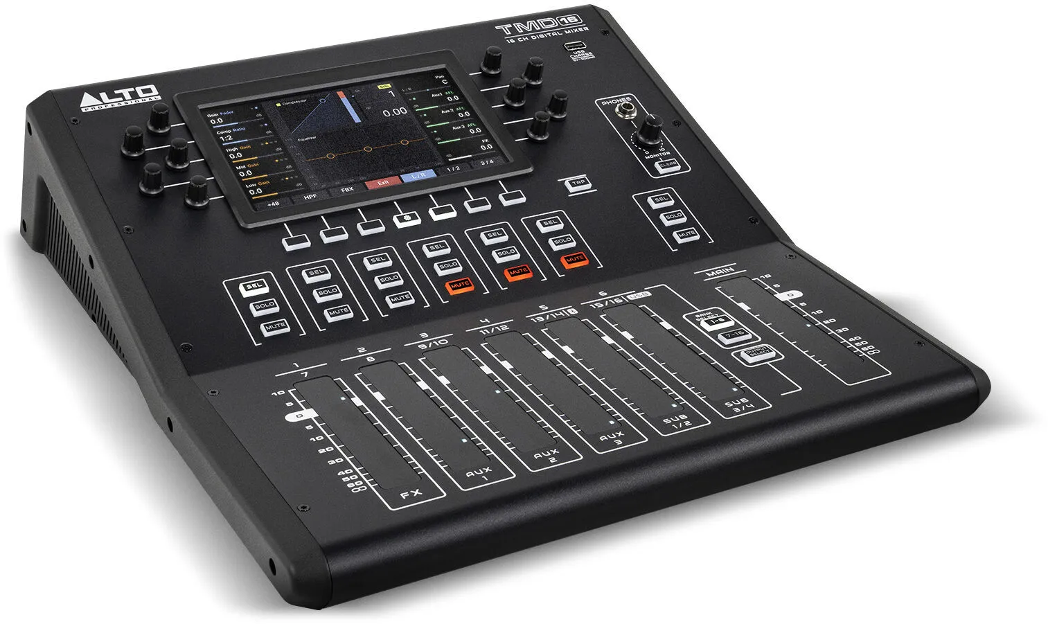 The Alto Professional TMD16 is a powerful yet easy-to-use 16-channel digital audio mixer designed for live sound applications in small music venues, rehearsal spaces, event centers, houses of worship, and more.