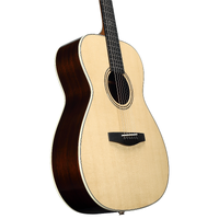 Only our finest, wonderfully quartersawn and silked Sitka, as well as hand selected African Mahogany is used in Laureate Series. The stiffness and quality of the tops allow us to thickness sand them just a tad thinner to help heighten response. Backs and sides are cut from the best East Indian Rosewood and African Mahogany that comes into our possession; bookmatched with perfect coloring.