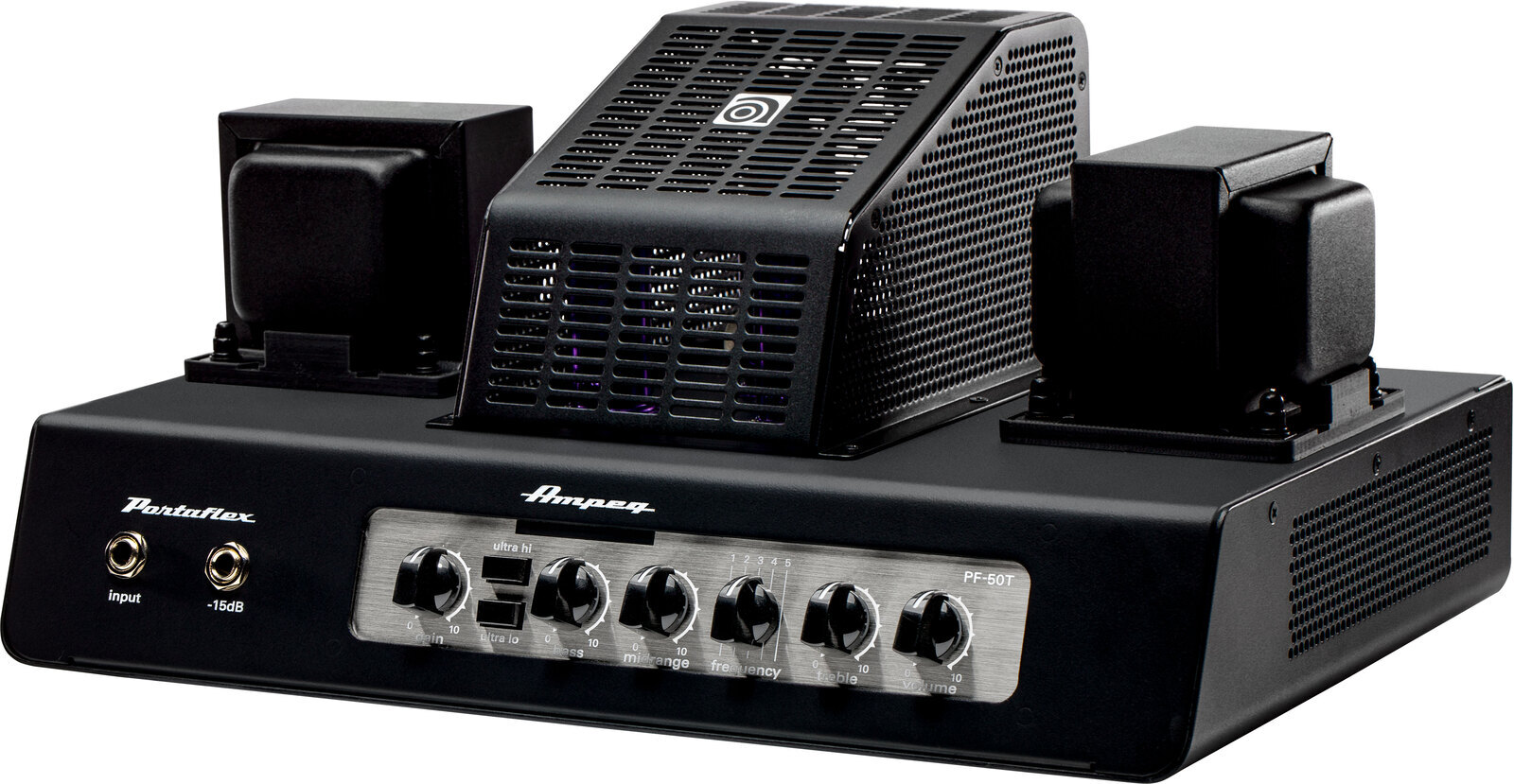 The legendary tone and portability of the all-tube Ampeg Portaflex amplifiers is faithfully reproduced in the PF-50T. This all-tube Portaflex head provides a harmonically rich and studio-worthy 50 watts of pure Ampeg tone to satisfy the most discerning bass player. Featur ing simple user-adjustable bias adjustment for easy tube replacement and pre-amp and transformer balanced direct outs for maximum versatility. Plus, no speaker load is required for silent recording or even use as a dedicated tube DI. Pair it with the PF-112HLF for the ultimate compact all-tube bass rig.
