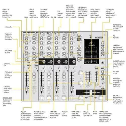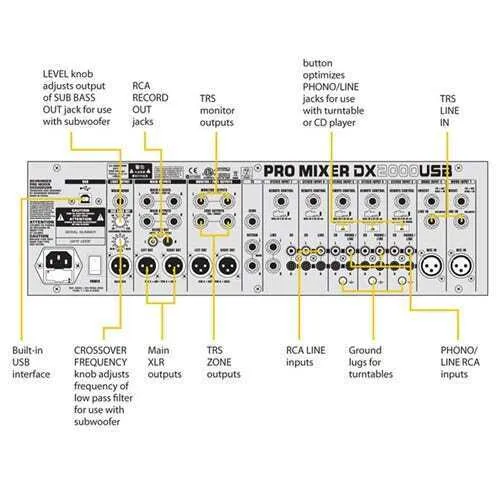 These days a DJ gig can command a lot more than a mic and a couple of turntables. You may need to accommodate a multimedia presentation, a variety of audio platforms (vinyl, CDs, mp3) and multiple mics—all at the same event! That’s why BEHRINGER is proud to present the 7-channel DX2000USB with its built-in USB/audio interface—an invaluable tool for the DJ-of-all-trades.