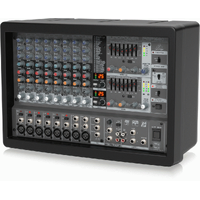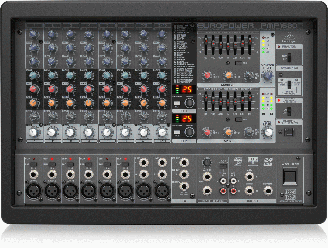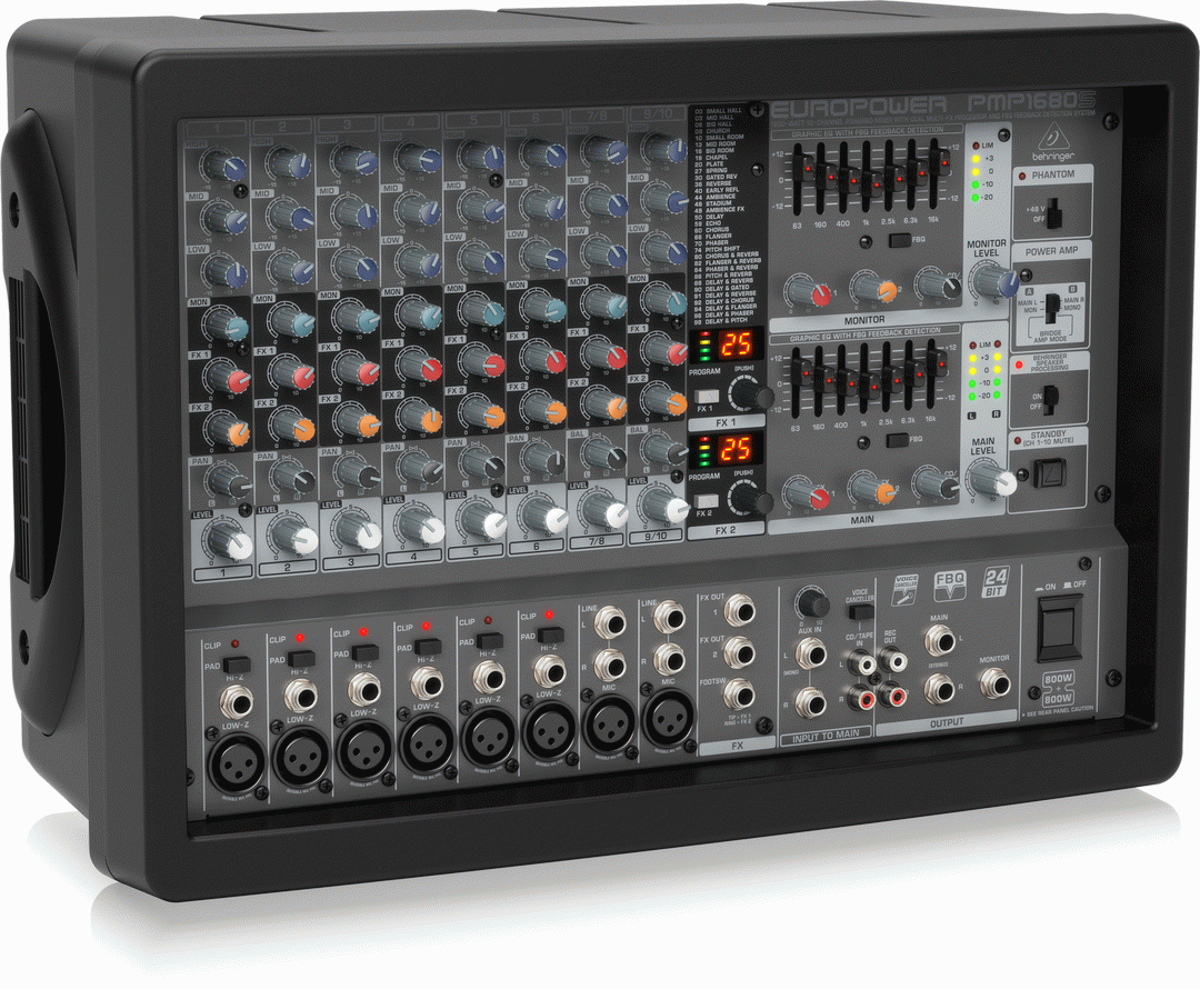 The 10-channel PMP1680S features 8 high-quality mic preamps, 2 stereo channels, dual 24-bit Multi-FX processors with 100 awesome presets including studio-class reverbs, delays, pitch shifter and various multi-effects, plus a 7-band stereo graphic EQ with our proprietary FBQ Feedback Detection System – for the ultimate in feedback-free performance.