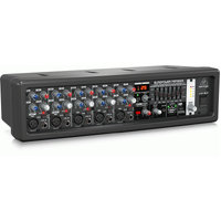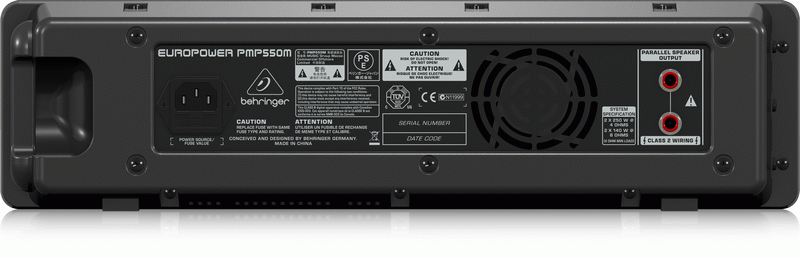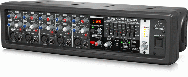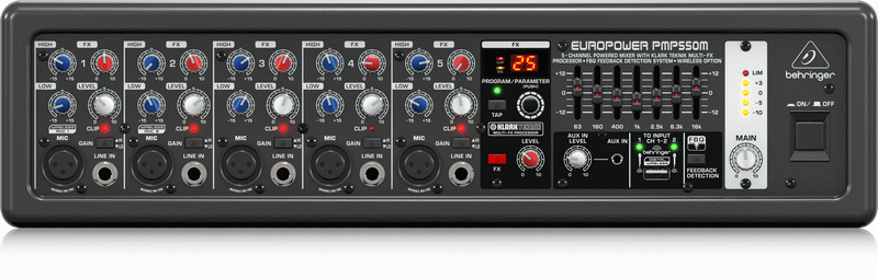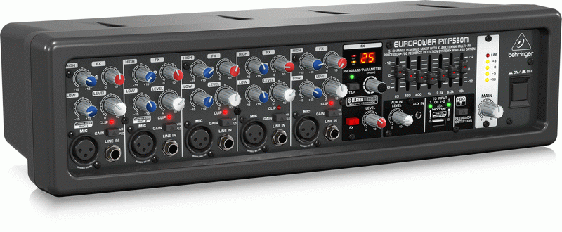 The amazing PMP550M Powered Mixer packs tremendous power (2 x 250 Watts dual mono), while maintaining an incredible power-to- weight ratio. These mixers employ high-efficiency Class-D technology and a state-of-the-art switch-mode power supply, which significantly reduces weight and heat. The 5-channel PMP550M features 5 high-quality mic preamps (2 of which also accept our ULM Digital Wireless Microphones, available separately) and a 1⁄8 Aux Input for playing music from your smart devices.