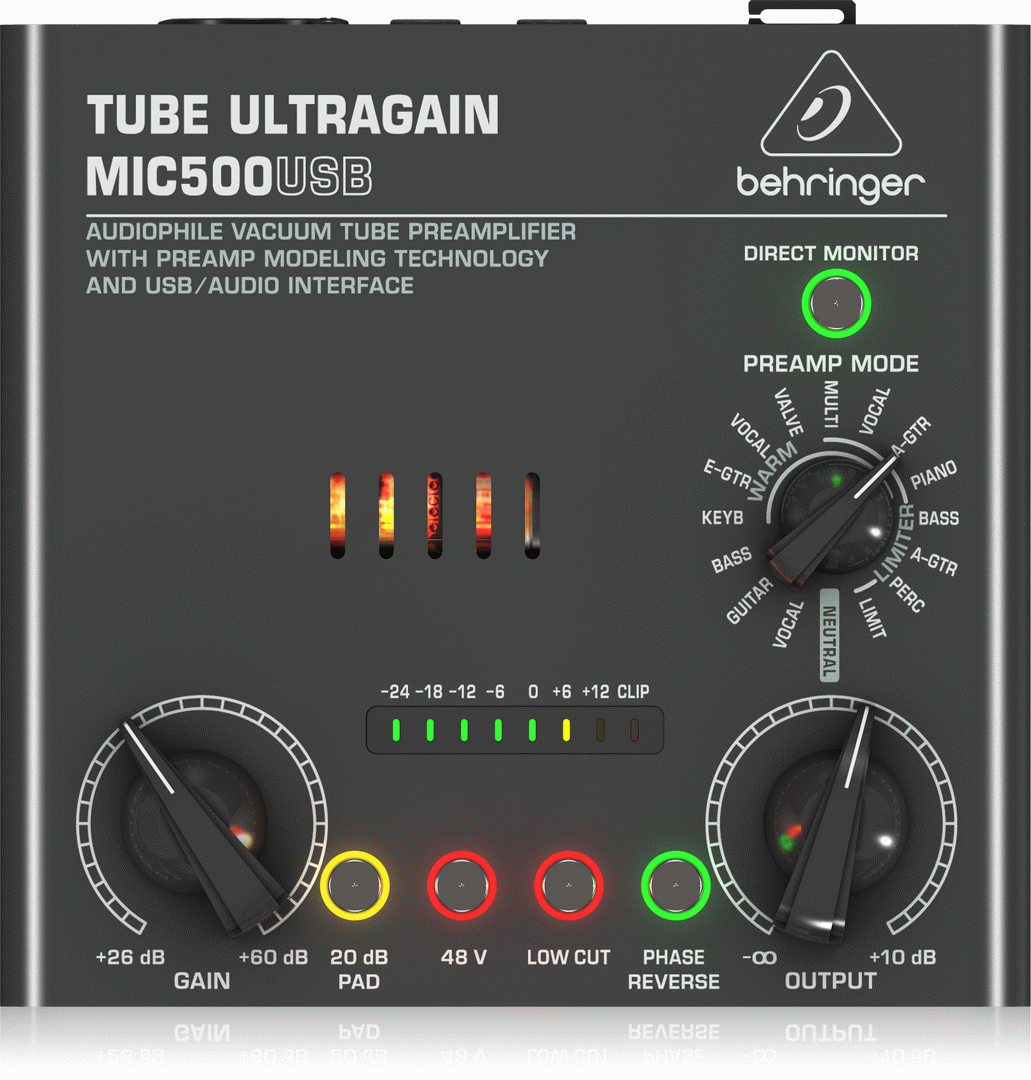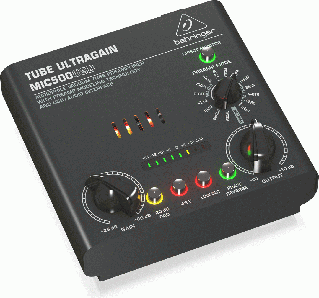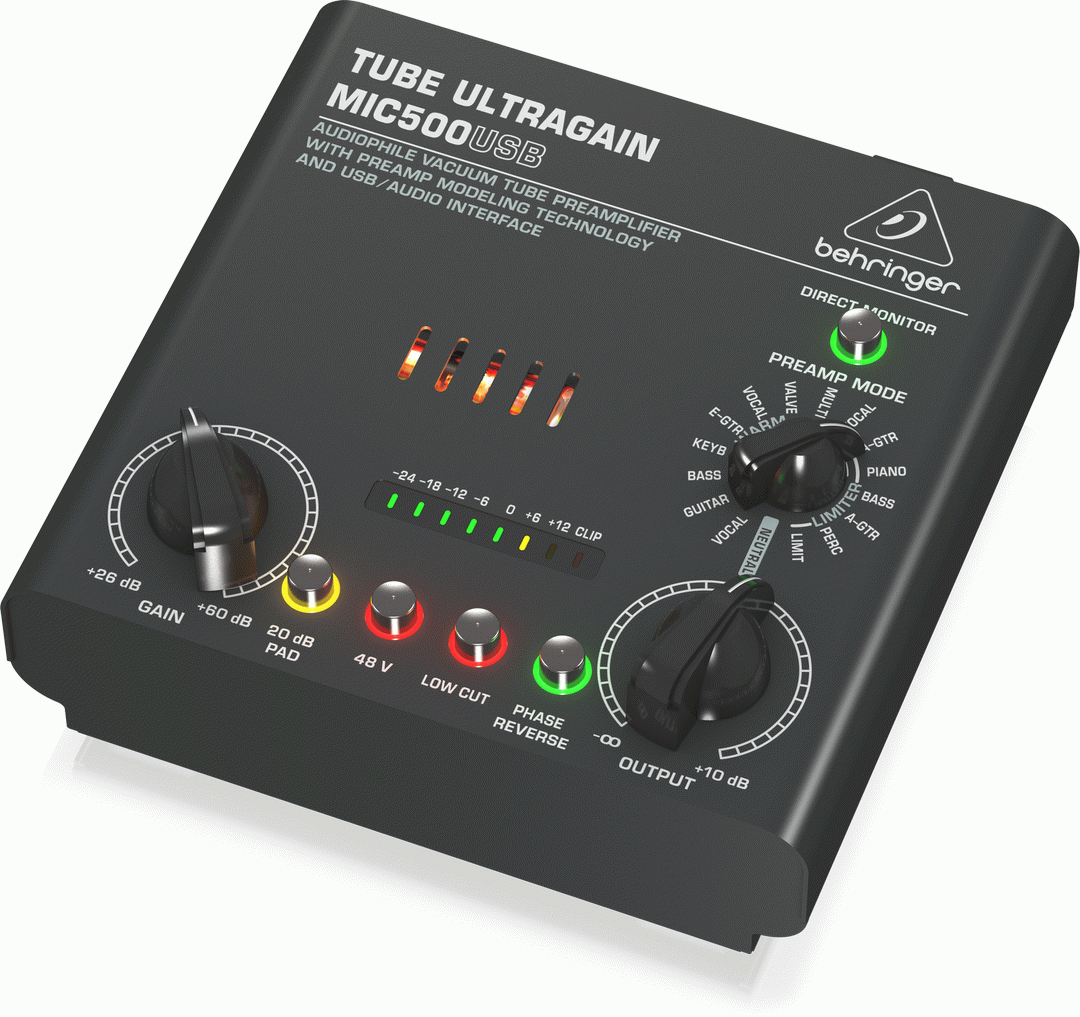 Tubes can really warm up a signal fast, giving it depth and character. Though transistors have succeeded the technology, many musicians agree that tubes deliver a far superior sound. The TUBE ULTRAGAIN MIC500USB’s hand selected 12AX7 vacuum tube gives everything from microphones to acoustic or bass guitars that vintage tube vibe – in a dependable and ultra-affordable package. High-end pre-amplification for all microphone, instrument and line-level sources. Specifically designed for studio-grade condenser mics