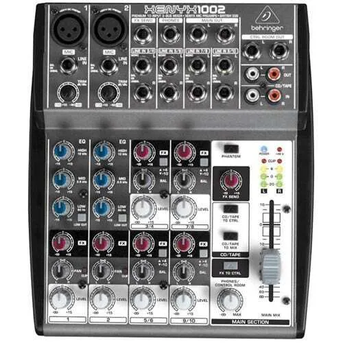 The Behringer Eurorack UB1002 is a 10-input, 2-bus mic/line mixer with two of Behringer's "Invisible" mic preamps, musical-sounding 3-band EQ, and a switchable low-cut filter on all mono channels.