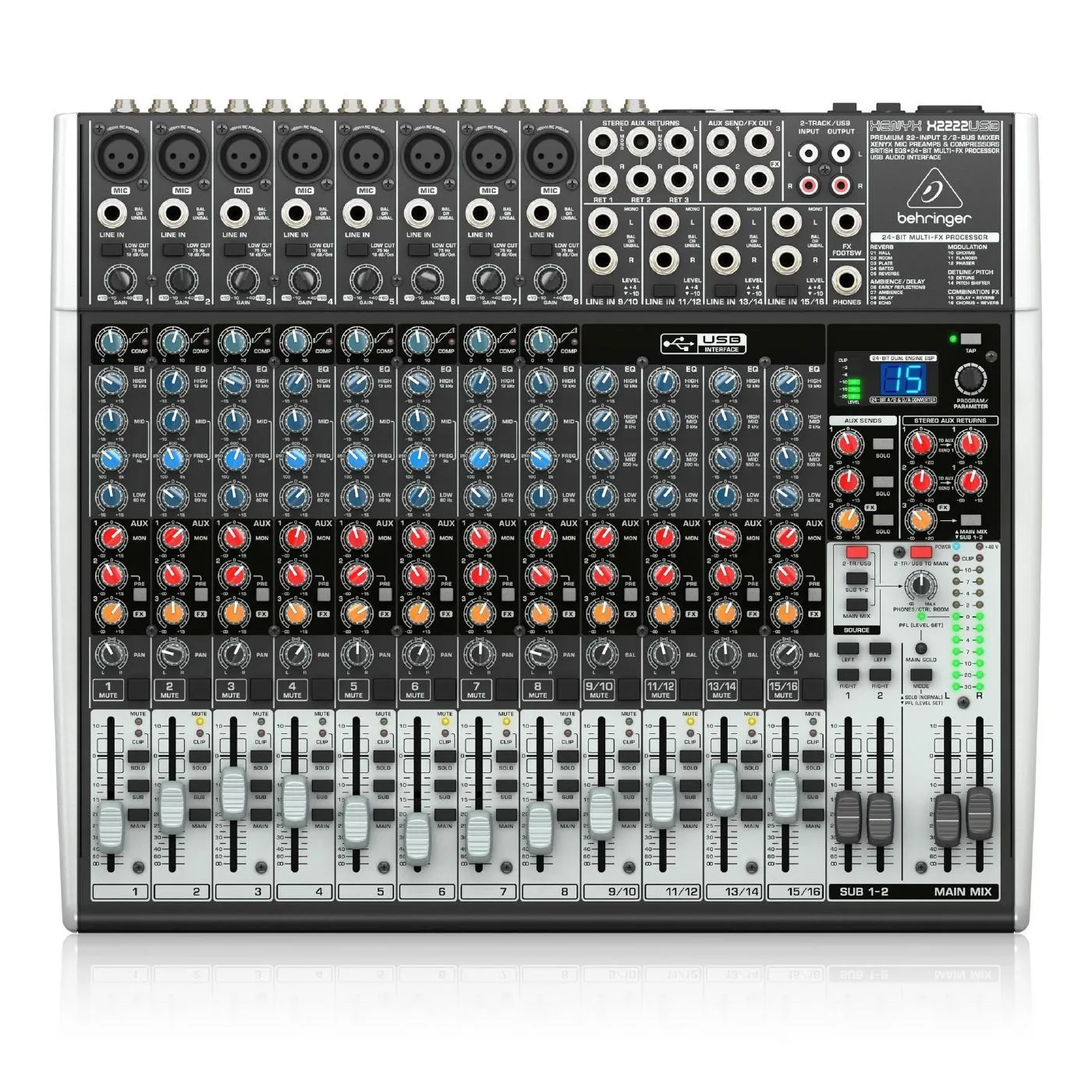 Add to this our 24-bit, dual-engine Multi-FX processor with 16 editable, professional-grade presets including reverb, chorus, fl anger, delay, pitch shifter and multi-effects – and the X2222USB becomes an incredibly versatile mixer for your live performances.