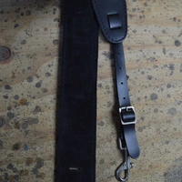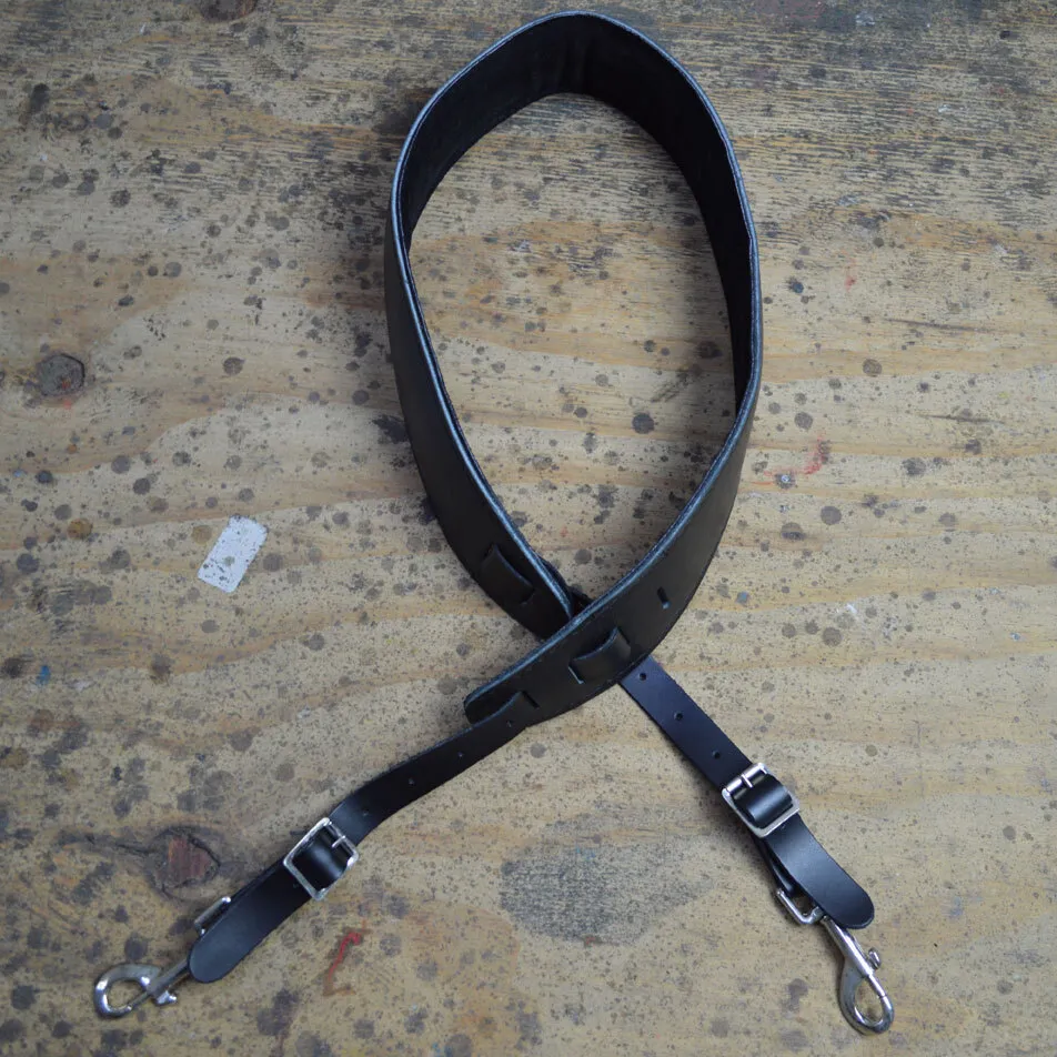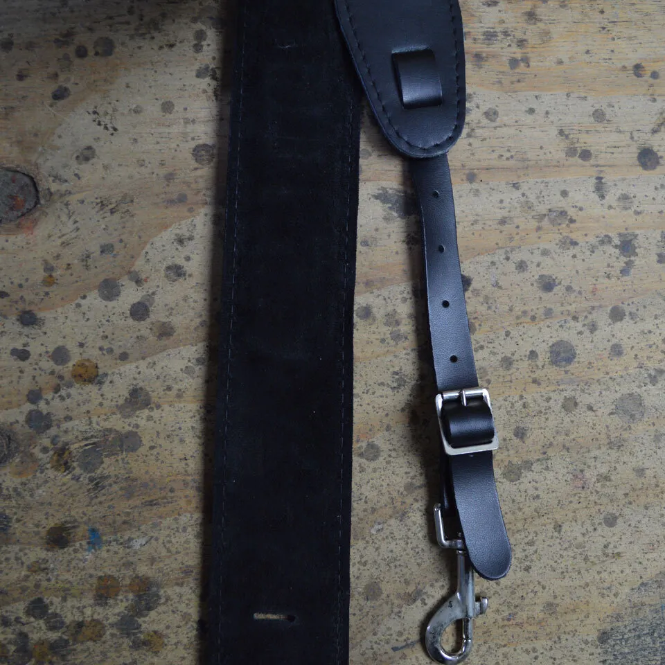 2.5″ leather, suede backed and stitched banjo cradle with metal hooks. Featuring a foam pad insert for extra comfort.