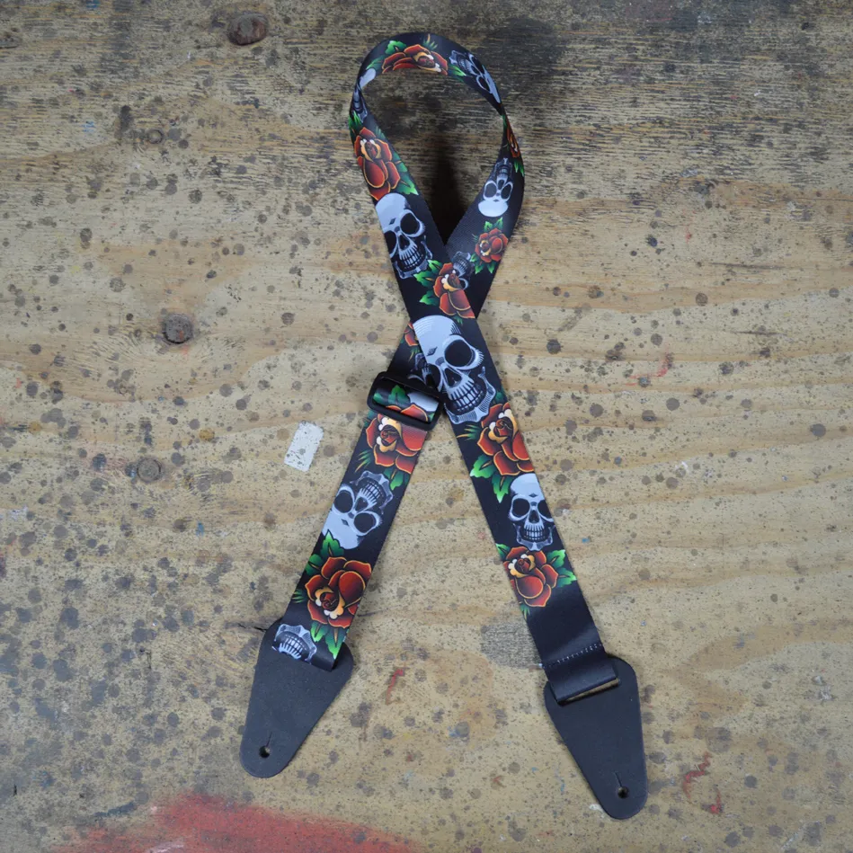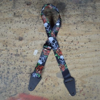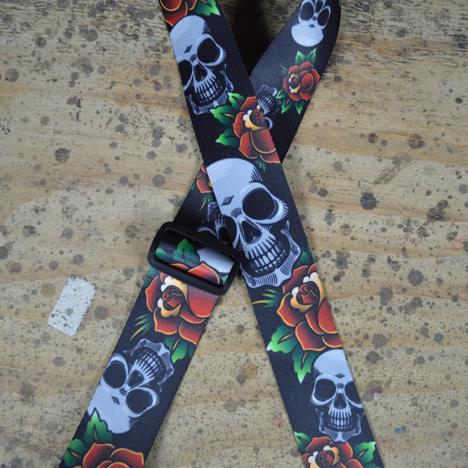Printed 50mm webbing guitar strap with skulls and flowers.