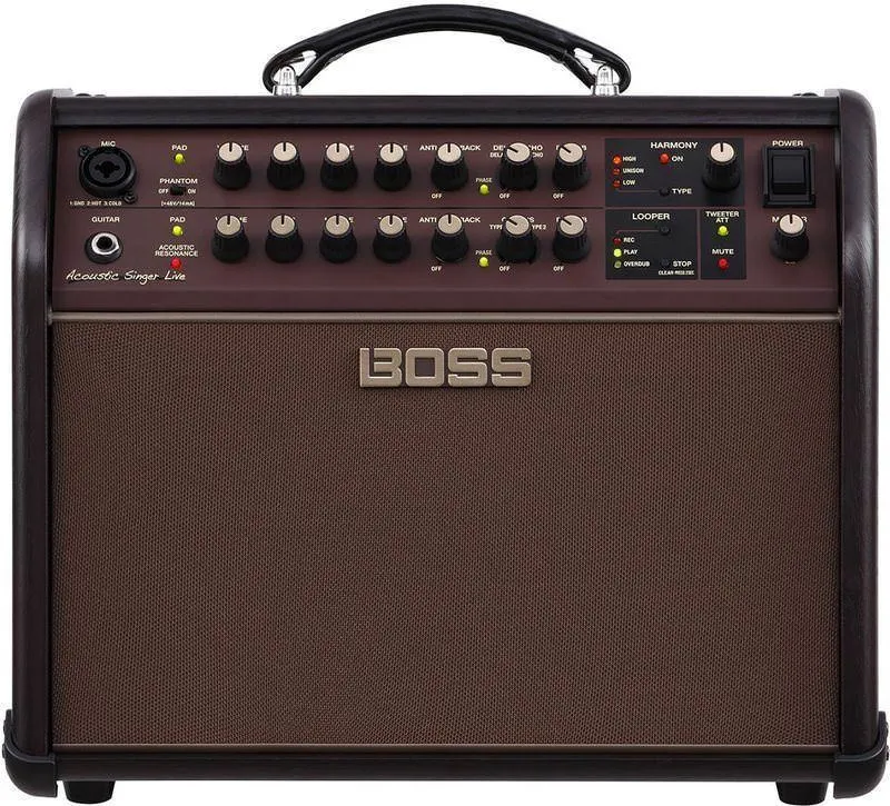 mplifying your acoustic guitar with the Acoustic Singer Live is a truly inspiring experience. BOSS engineers worked tirelessly to accurately reproduce the instrument’s fast transient response and natural, three-dimensional feel, and each amplifier element was carefully developed to achieve this. A powerful bi-amp design with extended peak power delivers tight, high-definition sound with ultra-clean broadband frequency response. The custom woofer and dome tweeter feature innovative materials and precision design points that work together to fill the stage with rich, naturally diffused sound. Other fine details include a unique cabinet construction method that eliminates unwanted resonances, and an integrated tilt-back design for maximum projection.