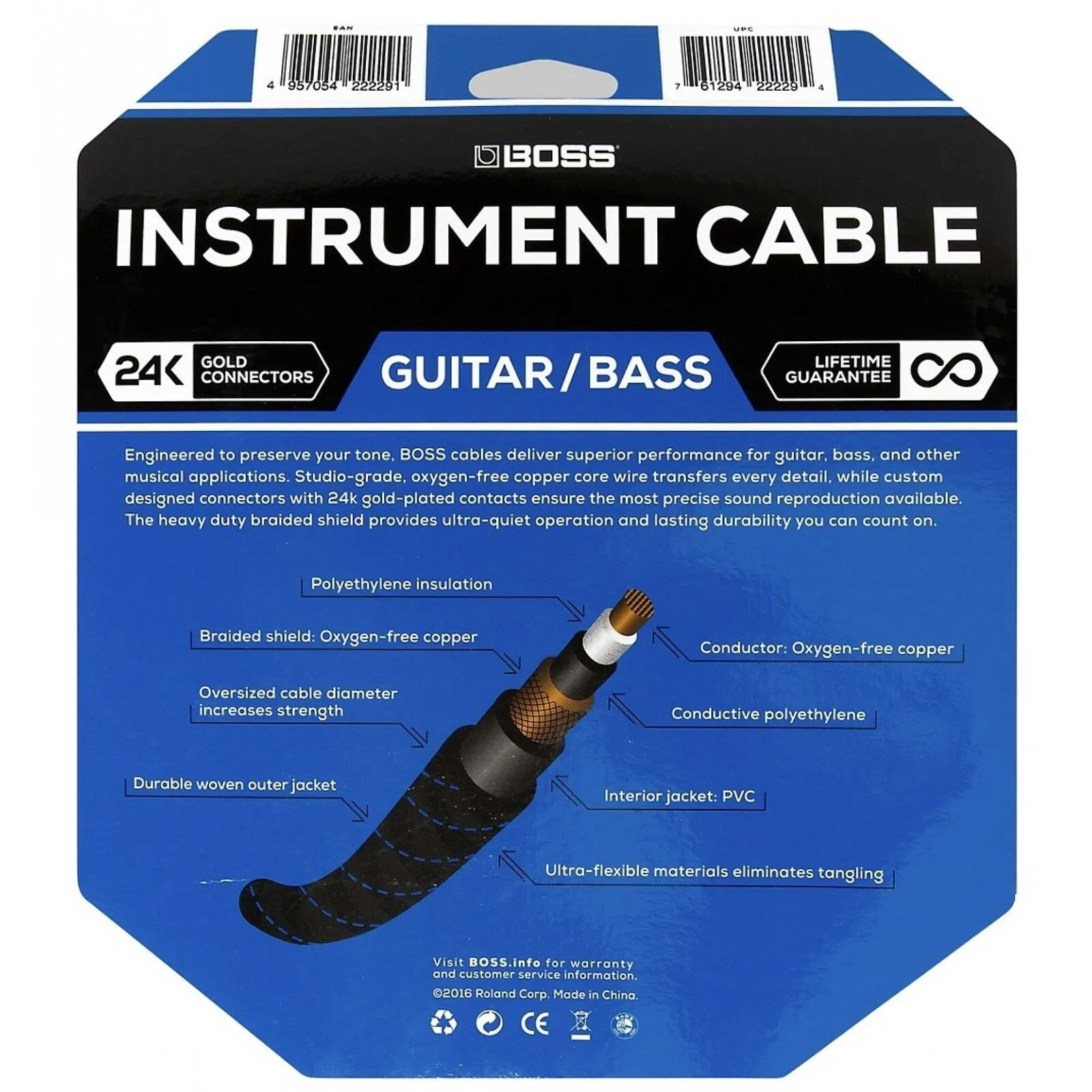 Engineered to preserve your tone, BOSS cables deliver superior performance for guitar, bass, and other musical applications. Studio-grade, oxygen-free copper core wire transfers every detail, while custom-designed connectors with 24K gold-plated contacts ensure the most precise sound reproduction available. The heavy-duty braided shield provides both ultra-quiet operation and lasting durability you can count on.