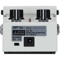 The BP-1W features high-quality buffer circuitry with two selectable types. Slide the rear panel switch to choose between the pure signal of a standard buffer or a vintage buffer with lower input impedance. The vintage type produces a warmer tone and a smooth dynamic response, with maximum benefits achieved by connecting a guitar with passive pickups directly to the BP-1W’s input. The standard buffer is always engaged for signal conditioning when the pedal is bypassed, regardless of the buffer switch setting.