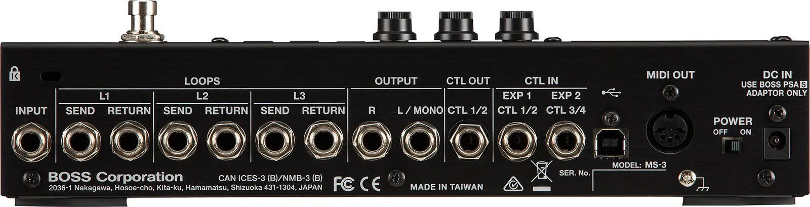 The MS-3’s heavy-duty footswitches give you easy command of the entire system. In Memory mode, the footswitches allow you to select patches and banks. Changing to Manual mode lets you switch loops and effects on/off, and even control multiple effects parameters for intense real-time expression. Your Manual mode assignments can be stored in patches, letting you create dynamic custom setups for different songs and styles. Going well beyond the basics, the MS-3 provides tons of options for expanded control. You’re able to connect external footswitches for tap tempo, effects on/off, and parameter adjustment, plus expression pedals for volume, wah, pitch shift, and more. Control out jacks are available for switching amp channels and controlling effects that support external input. And there’s even MIDI for sending tempo, PC, and CC information to MIDI-enabled pedals, whether they’re connected to loops or not. In addition, the MS-3’s two audio outputs can be set for full stereo or selectable mono operation per patch, providing great flexibility with dual amp rigs.