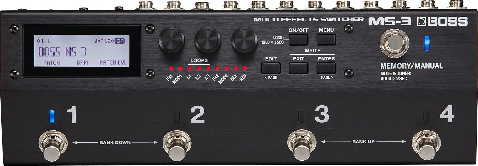 The MS-3’s highly flexible design gives you the freedom to create any kind of effects system, from simple to complex. It can serve as a general-purpose effects unit to augment core tone from three stompboxes, or function as the central hub of an advanced hybrid rig with MIDI gear and channel-switching amps. It even works as a standalone effects processor, making it perfect for fly dates and other times you need to travel light. And if you’re just starting out, the MS-3 provides a solid effects foundation that can be expanded as your experience grows. Via the MS-3’s audio loops, you can connect three different effects devices to the system. You’ll probably want to hook up your favorite drive and booster pedals to the loops, but you can use any effects you like. Once your pedals are connected, you’re able to switch the loops on/off individually, and position the MS-3’s onboard effects around them any way you want.
