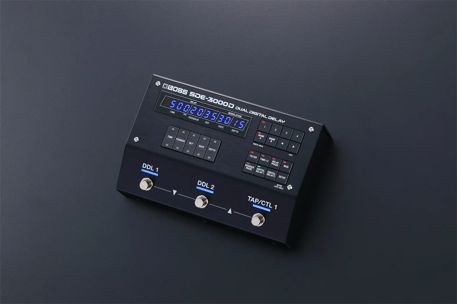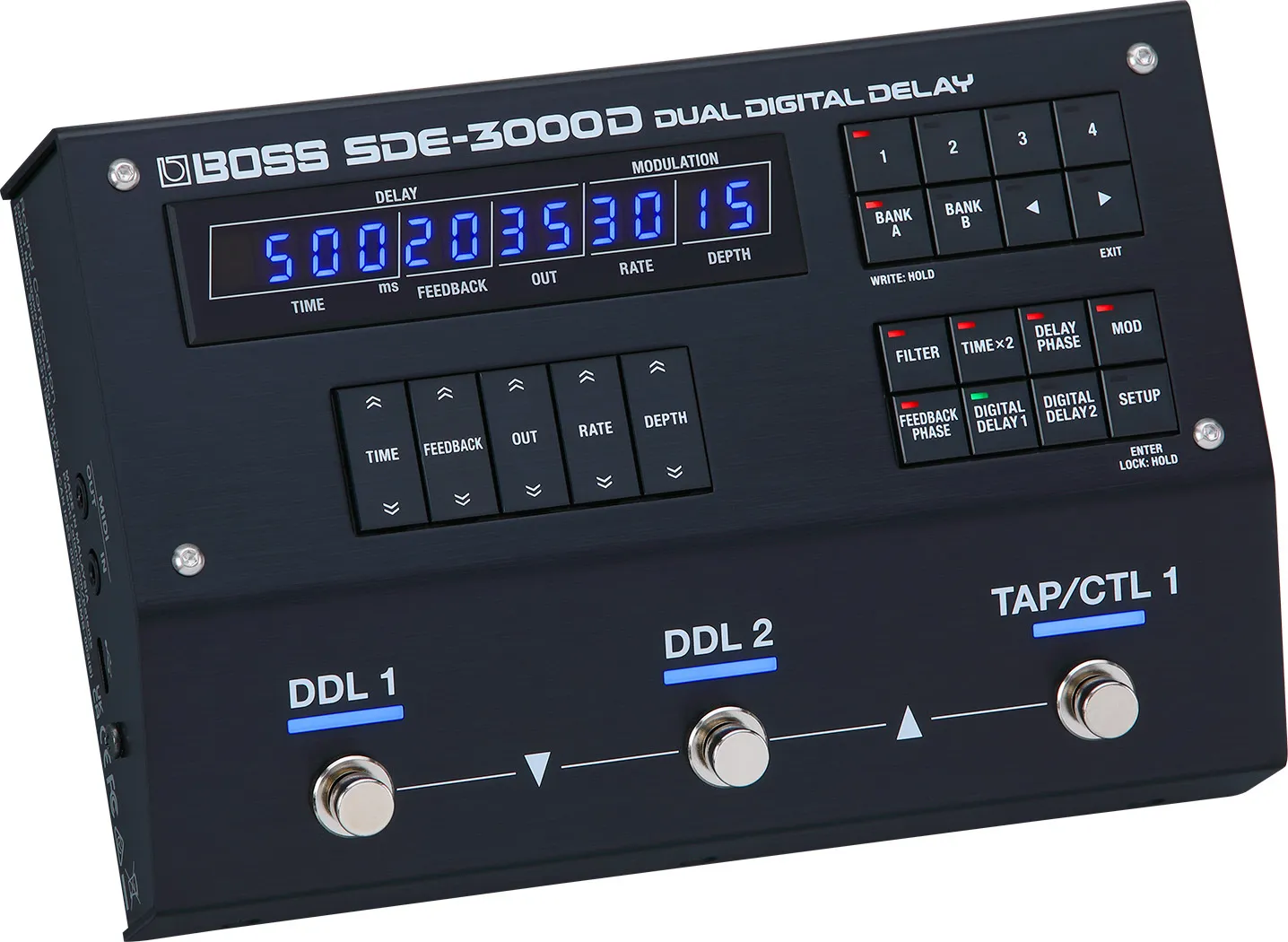 Controls - TIME button, FEEDBACK button, OUT button, RATE button, DEPTH button, 1--4 buttons, BANK A button, BANK B button, LEFT button, RIGHT button, FILTER button, TIME×2 button, DELAY PHASE button, MOD button, FEEDBACK PHASE button, DIGITAL DELAY1 button, DIGITAL DELAY2 button, SETUP button, DDL1 switch, DDL2 switch, TAP/CTL1 switch