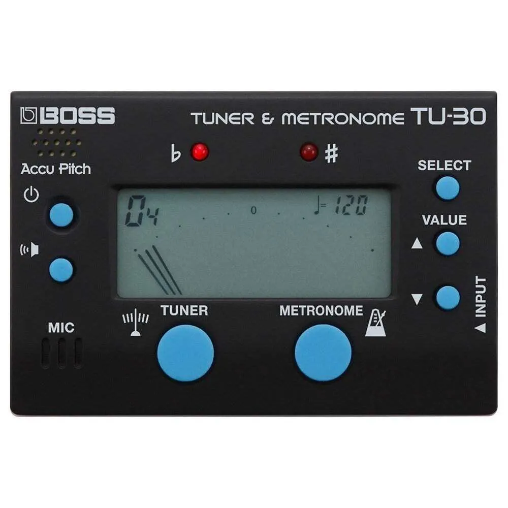 For years, the TU-80 Tuner & Metronome has been an essential tool for musicians and music educators everywhere. With the TU-30, BOSS delivers the TU-80’s main features in an even more compact size. All the basics are carried over, including Accu-Pitch, multiple tuning modes and rhythm patterns, the ability to sound reference pitches, and more. Combining trusted BOSS tuning with a versatile metronome, the TU-30 is a must-have companion for learning, practice, and performing.