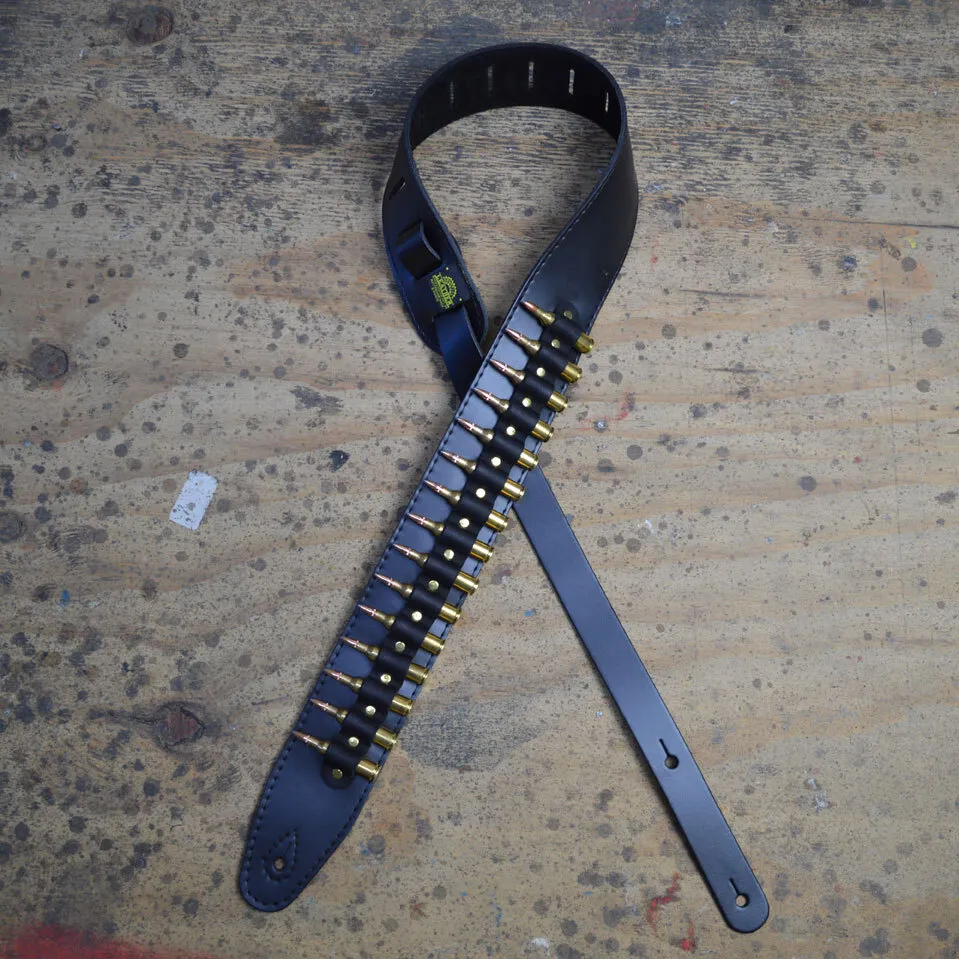 Brass Shells on Black Leather Guitar Strap