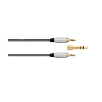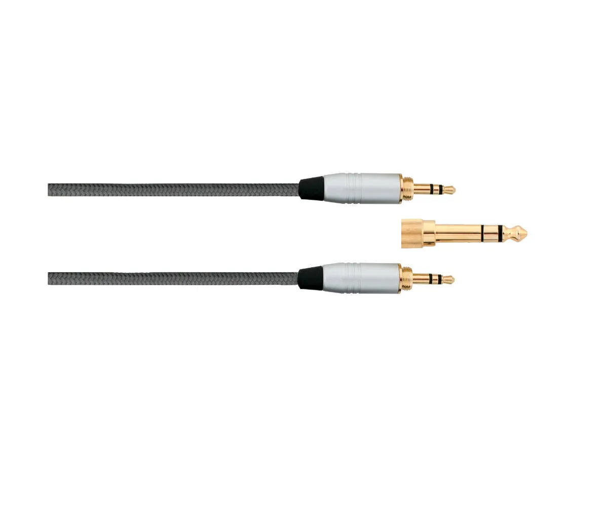 3.5mm stereo Jack plug (M) with 6.3mm (1/4") adaptor to 3.5mm stereo Jack plug (M). High quality 4.5mm OD grey overbraid audio cable.