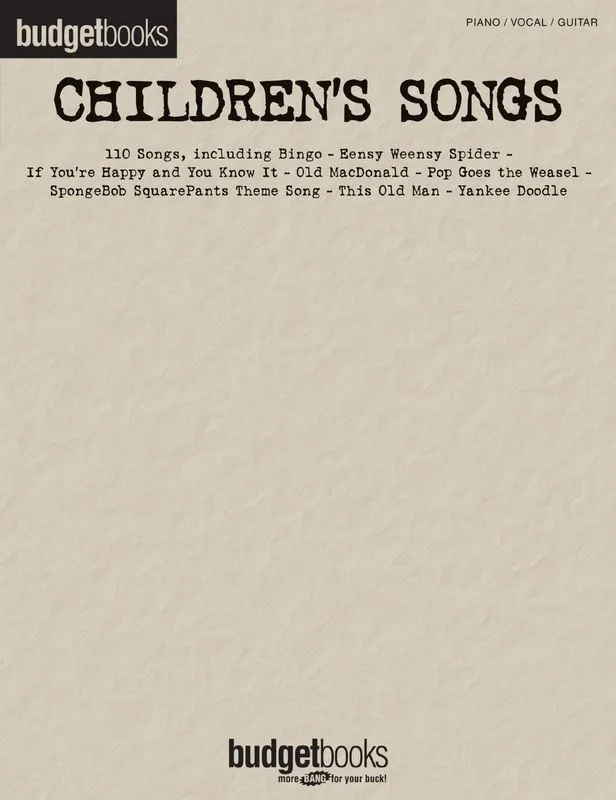 This fabulous collection includes 110 songs that kids love, from favorite folksongs to movie & TV themes. Includes: Alphabet Song · Animal Crackers in My Soup · Be Our Guest · The Bear Went Over the Mountain · Bingo · Bob the Builder Intro Theme Song · Do-Re-Mi · Eensy Weensy Spider · Hakuna Matata · Home on the Range · I'm Popeye the Sailor Man · It's a Small World · London Bridge · My Favorite Things · Oh! Susanna · Old MacDonald · On Top of Spaghetti · The Rainbow Connection · Sesame Street Theme· SpongeBob SquarePants Theme Song · Yankee Doodle · You've Got a Frien d in Me · and more.