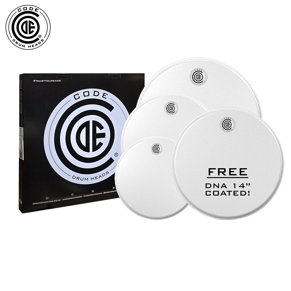 The Code DNA Coated Fusion+ Pack delivers the timeless, warm tone that drummers love, paired with a strong attack and medium sustain. Designed for light to medium use, these single-ply 10 mil coated PET heads offer superior feel, consistent response, and exceptional durability. The included FREE 14" DNACT14CTD makes this pack an even greater value.