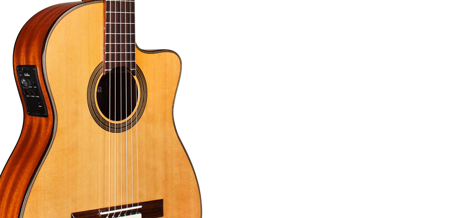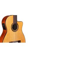 The 12 Natural is our intermediate-level crossover guitar featuring a comfortable, slim steel-string style neck (48mm nut width) with 16" radius fingerboard. Choose from a solid Canadian cedar top or European spruce top paired with mahogany back and sides. As the name suggests, the 12 Natural has 12 frets to the body, allowing the bridge to sit further back on the soundboard, where resonance is optimized for a large sound with long sustain. Thoughtful finishing touches such as a hand inlaid wooden rosette, 3 ply maple and ebony top purfling, and high gloss polyurethane finish makes this Fusion model both beautiful and practical. Plug in and play with the built in Fishman Presys preamp.