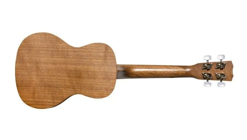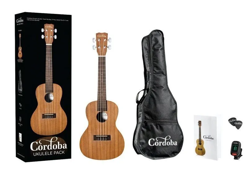 A complete ukulele package containing an all mahogany Cordoba concert ukulele, travel bag, digital clip-on chromatic tuner with color display, picks, and a ukulele chord and lesson book including lessons from Alfred Music Publishing. Comes with Aquila Nylgut strings.
