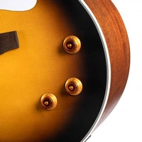 The vintage-style nickel open gear tuners with white oval knobs work smoothly while complementing the guitar’s vintage-retro aesthetics.