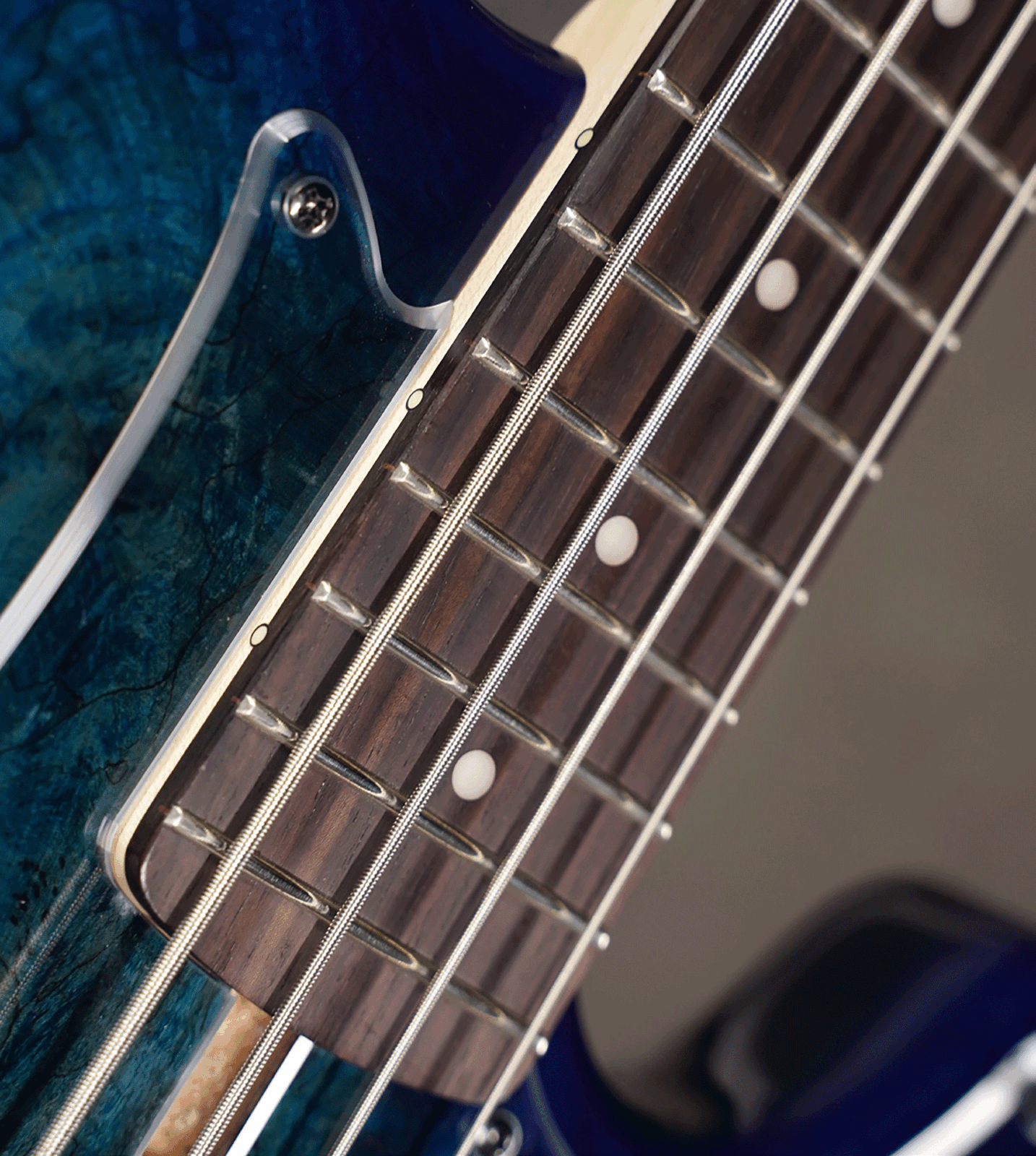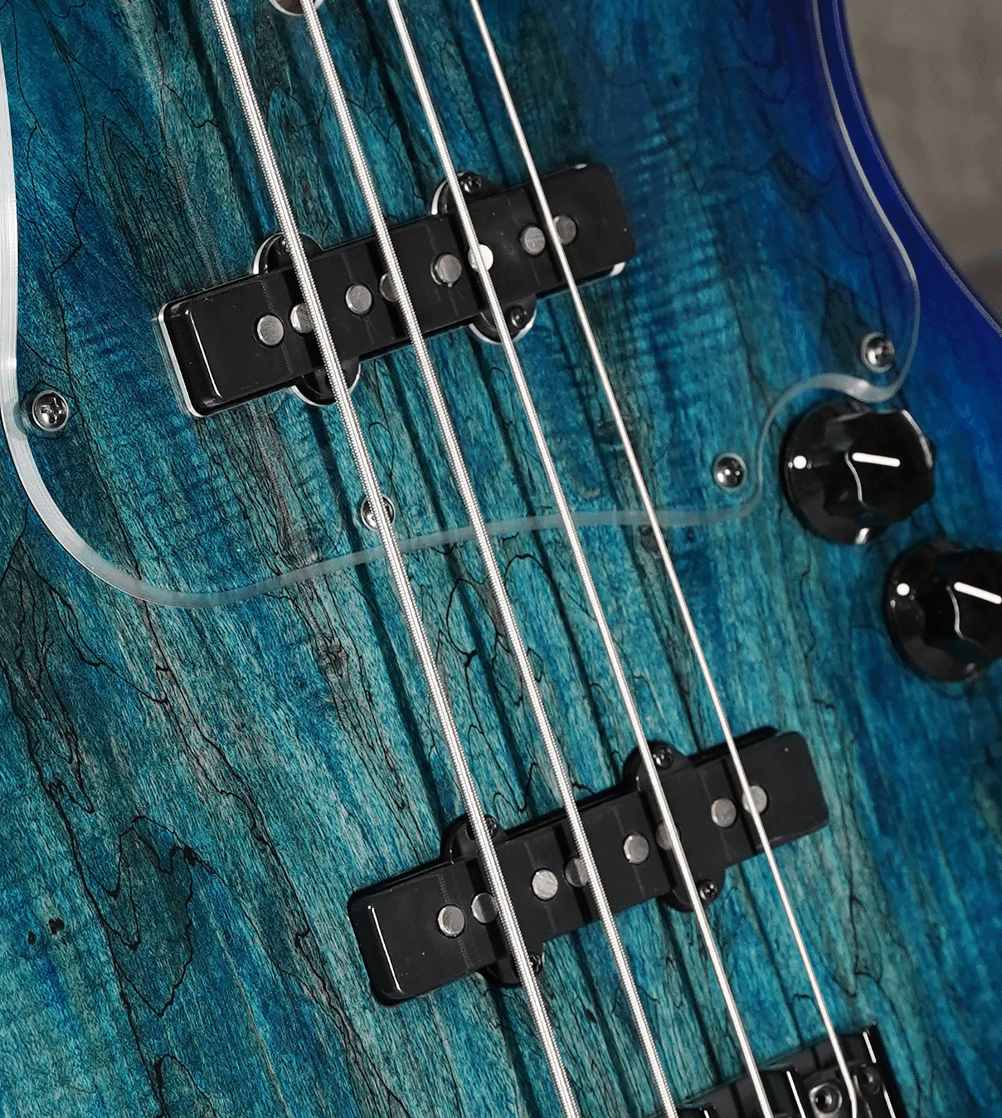 The Alder body provides a perfectly balanced tone while giving a slight boost on highmid range. It’s one of the most ideal tonewoods for solid body basses of major bass makers since the 1950’s. The spalted maple(veneer) adds a unique visual appeal to the instrument with its natural patterns.
