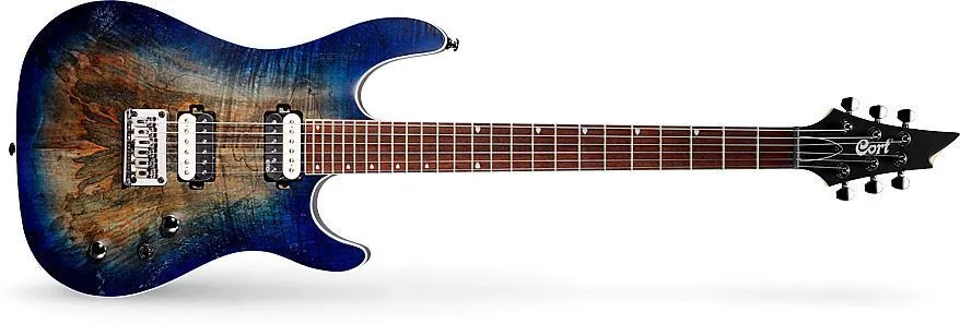 Cort`s X and KX series are sibling series (X features tremolo bridges, KX fixed) which offer modern, affordable take on the ubiquitous Superstrat/Soloist concept. Both series were redesigned and refreshed for 2018, receiving a total of nine models (five in X line, four in KX). KX300 is the second-most expensive model of the fixed-bridge KX series (topped only by KX500FF). It is an affordable six-string metal axe with a fixed bridge, available in Open Pore Raw Burst and Open Pore Cobalt Burst (white binding, chrome hardware, black headstock). Main construction features include a solid mahogany body w/spalt maple top, a hard maple neck (smooth finish, fast contour), a 24-fret jatoba fingerboard, string-thru-body hardtail bridge, zebra-coiled EMG RetroActive pickups, and die-cast tuners.