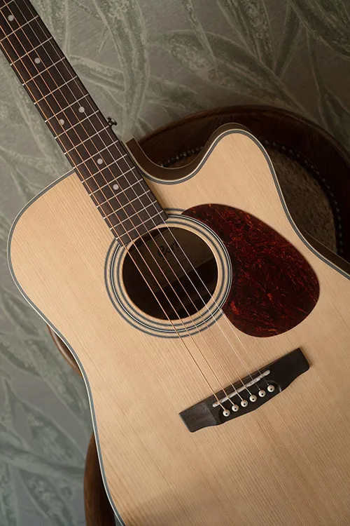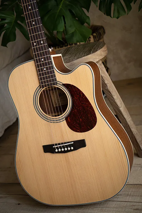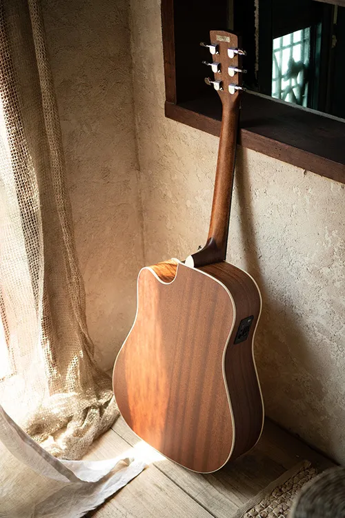 Bright yet natural with a strong and warm midrange, the beloved mahogany wood has been a standard for back and sides on premium acoustics for many decades.
