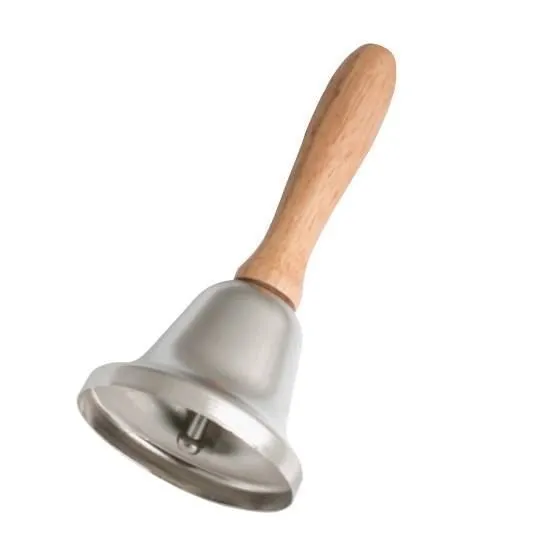 Hear Ye! town crier bell. Silver finish. Metal bell with wooden handle. 6½” long.