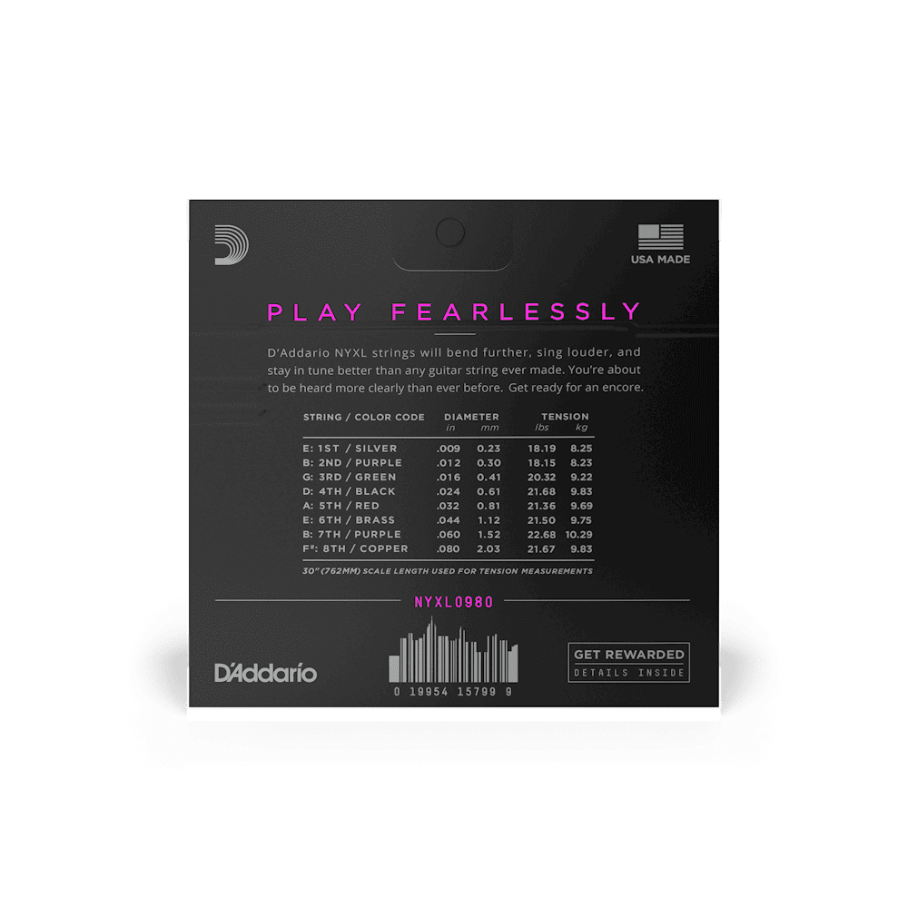 NYXL0980 is optimized for 8-String electric guitars. The high carbon steel used in NYXL strings offers higher break strength, enhanced tuning stability, and accentuated mid-range frequency response.