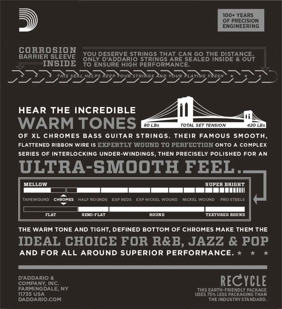 ECB82 is a medium gauge flat wound string set for long scale electric bass. XL Chromes are noted for their smooth feel and warm, mellow tone, essential to the sound and style of many jazz, blues, and rock players.