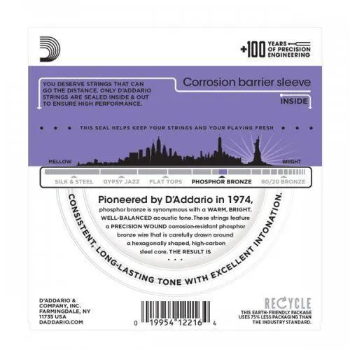 Phosphor Bronze was introduced to string making by D'Addario in 1974 and has become synonymous with warm, bright, and well balanced acoustic tone. D'Addario Phosphor Bronze strings are precision wound with corrosion resistant phosphor bronze onto a carefully drawn, hexagonally shaped, high carbon steel core. The result is long lasting, bright sounding tone with excellent intonation.