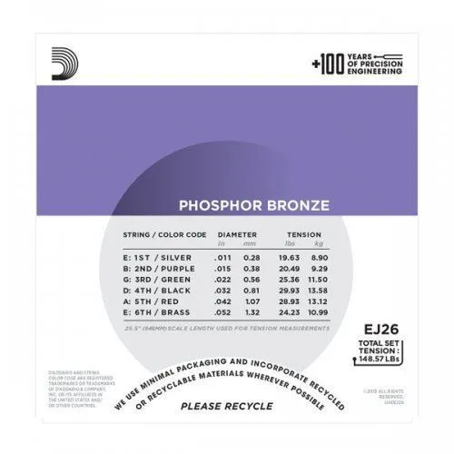 Referred to as Custom Light, EJ26 strings are a D'Addario original hybrid gauge and a comfortable compromise for players who want the depth and projection of light gauge bottom strings, but slightly less tension on the high strings for easy bending.
