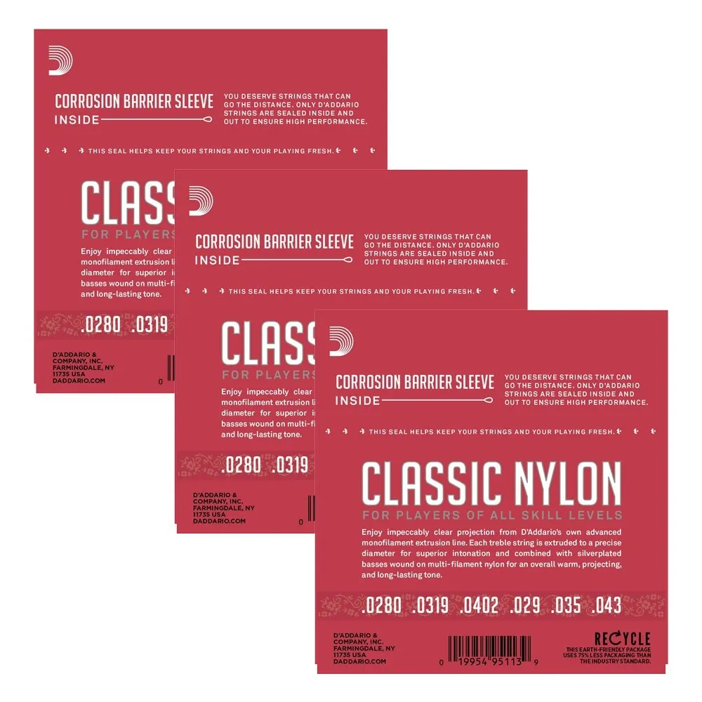 • Classic Nylon sets feature tie ends, nylon core basses wound with silver-plated copper, and clear nylon treble strings.