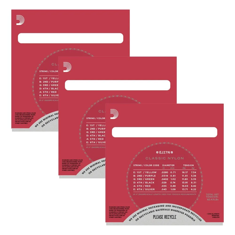 D'Addario EJ27N-3D Normal Tension Student Nylon Classical Guitar Strings - 3 Pack