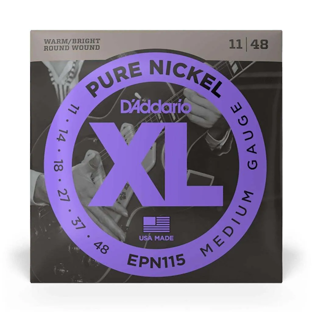 EPN115 is a medium light gauge string set for electric guitar that delivers a warm, vintage Pure Nickel strings produce the vintage guitar sound of the 1950's, an era when pure nickel wire was used to wind guitar strings. These strings produce the rich, warm tones heard in traditional blues, rock & roll, and country.