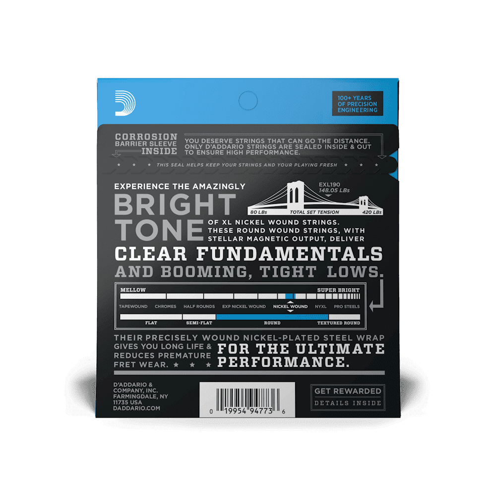 EXL190 is the Ideal combination of gauges for comfortable playing tension, distinctive bright tone, and powerful, tight low end. XL Nickel Wound electric bass strings, long recognized as the industry standard, are ideal for a wide range of musical styles.