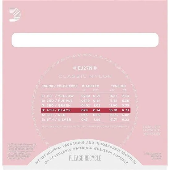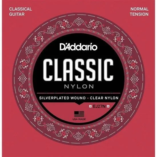 D'Addario's EJ27 Classic Nylon guitar strings are great for beginners, students and professionals alike. Each set contains 3 clear nylon trebles and 3 silver-plated copper wound basses for the optimal balance of warm and projecting, long lasting tone. Each set is held to same high standards as our professional string sets and may be used for all players looking for an inexpensive, but reliable set. The normal tension set is available for full and fractional 1/2 and 3/4 size classical guitars.