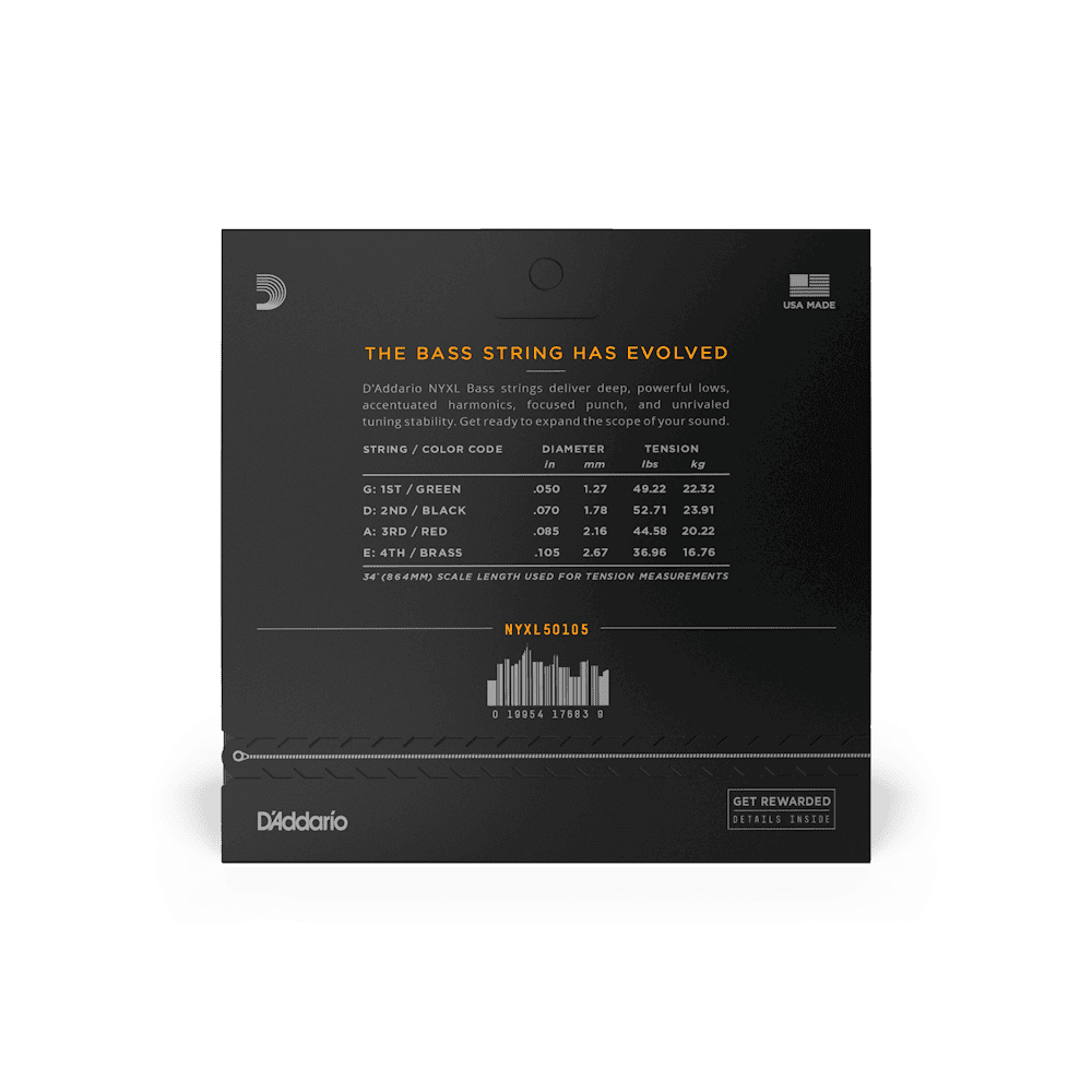 NYXL5015 is a medium gauge string set for long scale basses. The high carbon steel used in NYXL strings offers higher break strength, enhanced tuning stability, and accentuated mid-range.