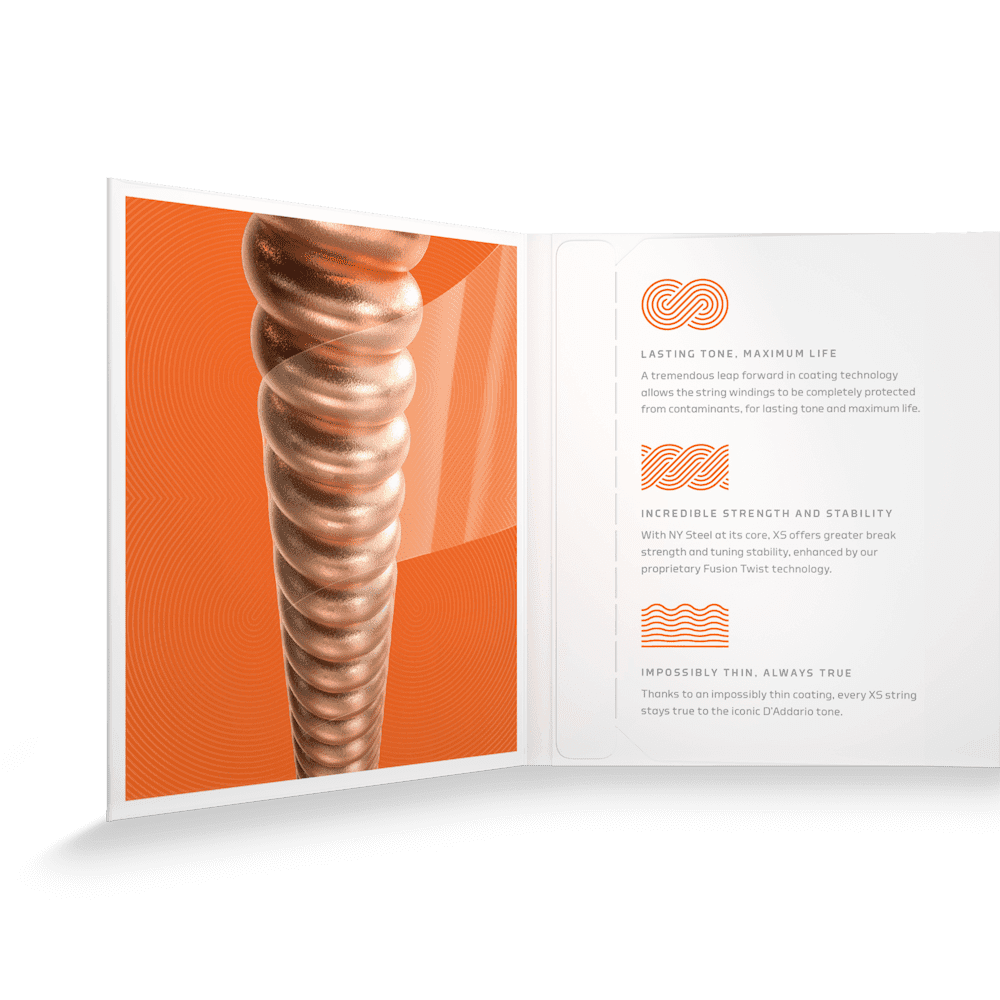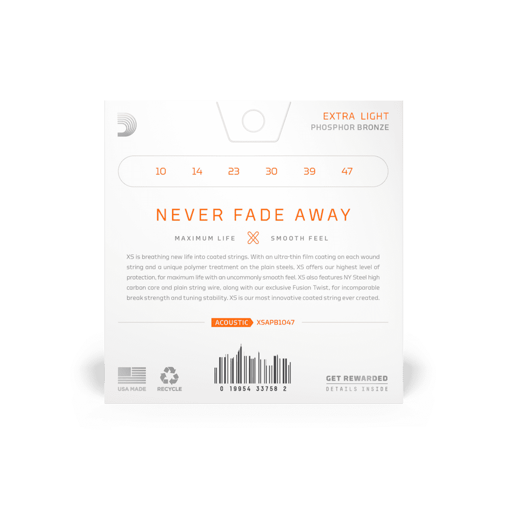 D'Addario XS Acoustic Phosphor Bronze combines our most popular acoustic alloy with our most advanced string coating technology, resulting in clear tone, smooth feel, and superior tuning stability — all with the longest possible string life. Available in Phosphor Bronze for 6 and 12-string acoustic guitar, ranging from extra-light to medium gauges.