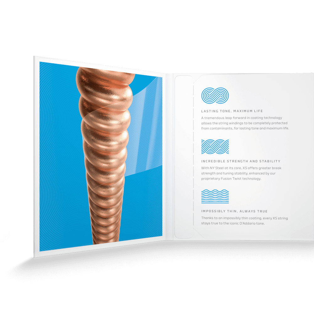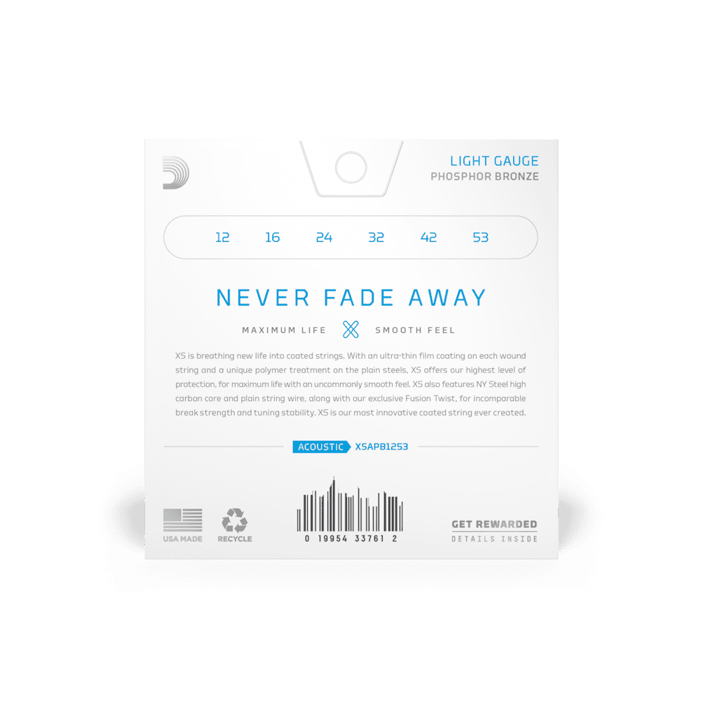 D'Addario XS Acoustic Phosphor Bronze combines our most popular acoustic alloy with our most advanced string coating technology, resulting in clear tone, smooth feel, and superior tuning stability — all with the longest possible string life. Available in Phosphor Bronze for 6 and 12-string acoustic guitar, ranging from extra-light to medium gauges.