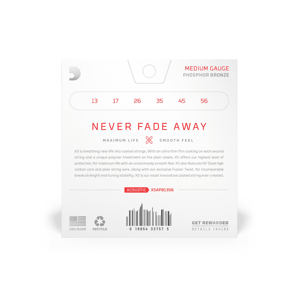 D'Addario XS Acoustic Phosphor Bronze combines our most popular acoustic alloy with our most advanced string coating technology, resulting in clear tone, smooth feel, and superior tuning stability — all with the longest possible string life. Available in Phosphor Bronze for 6 and 12-string acoustic guitar, ranging from extra-light to medium gauges.