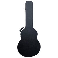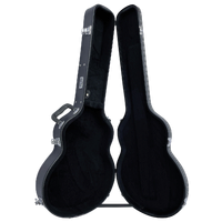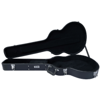 Semi acoustic thinline shaped standard case. Wood case, lined and With chrome hardware.