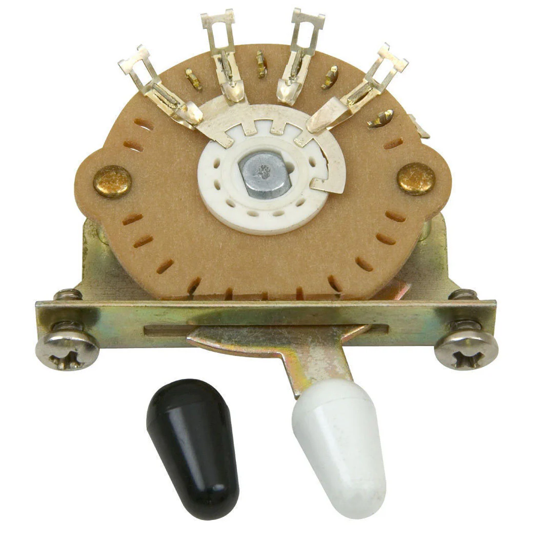 Open style 5 way pickup selector switch. Includes black and white knobs.