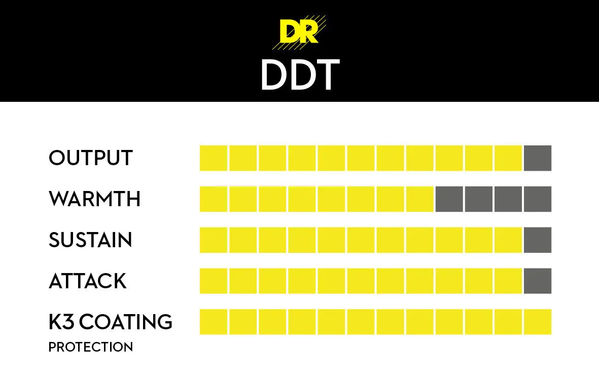DDT™ Electric Guitar Strings maintain their intonation at even the lowest tunings thanks to DR’s Coated Core Technology™ (CCT™).  A coated hexagonal core wire locks the nickel-plated steel wrap wire in place to increase stability at any tension. Now you can deliver notes at lower pitch that are clean, clear and in tune. Change tunings and you’ll be surprised how easily DDT's lock right in and stay there.