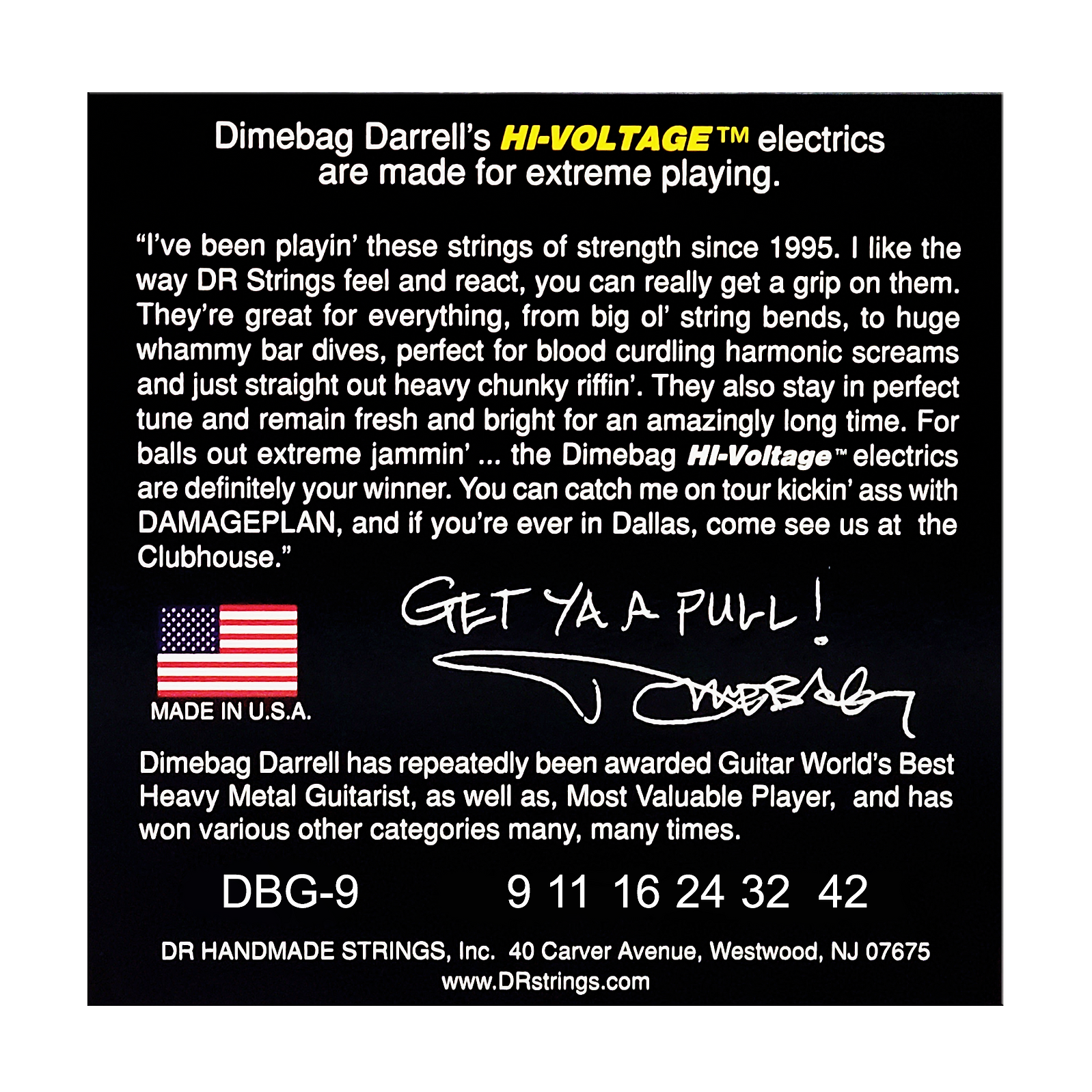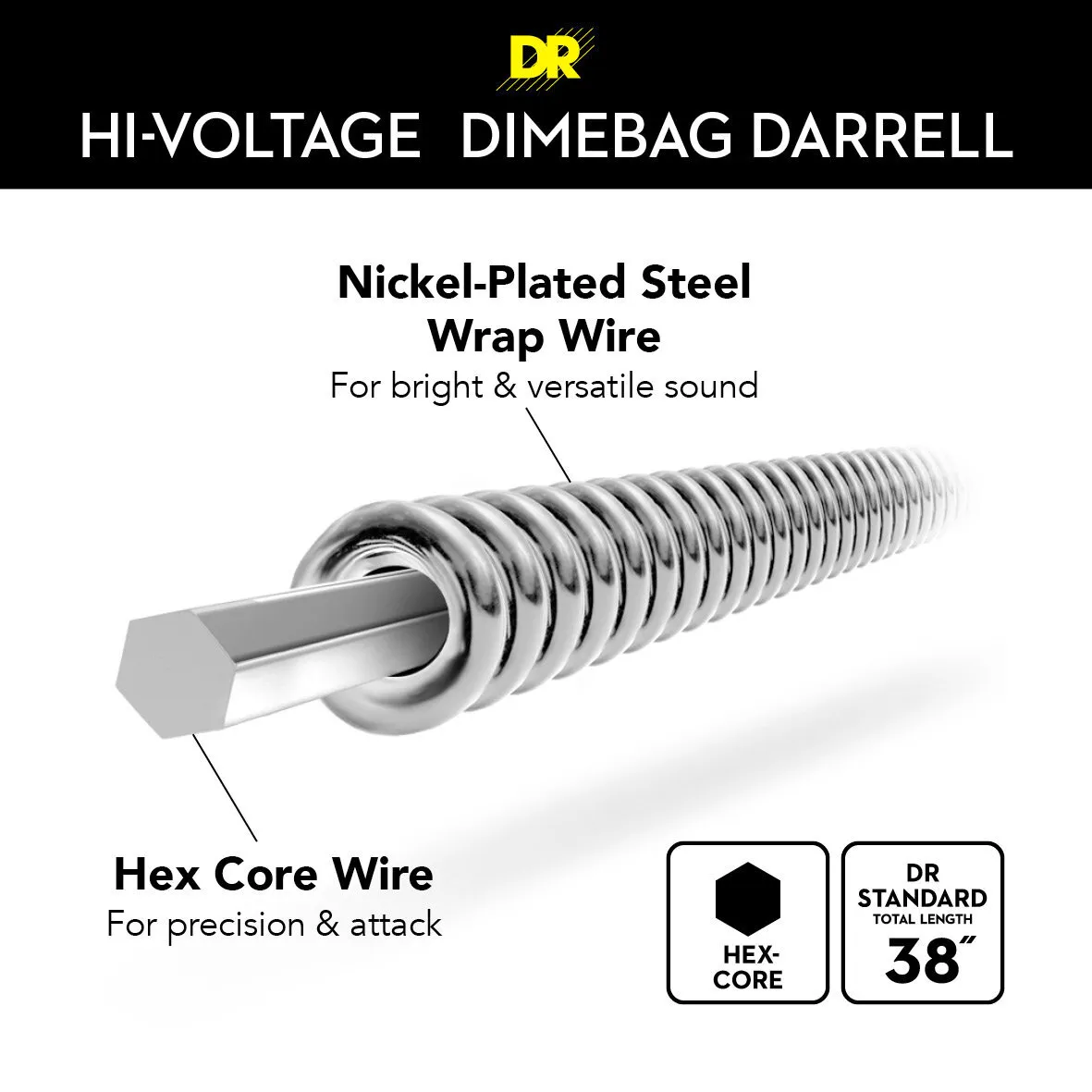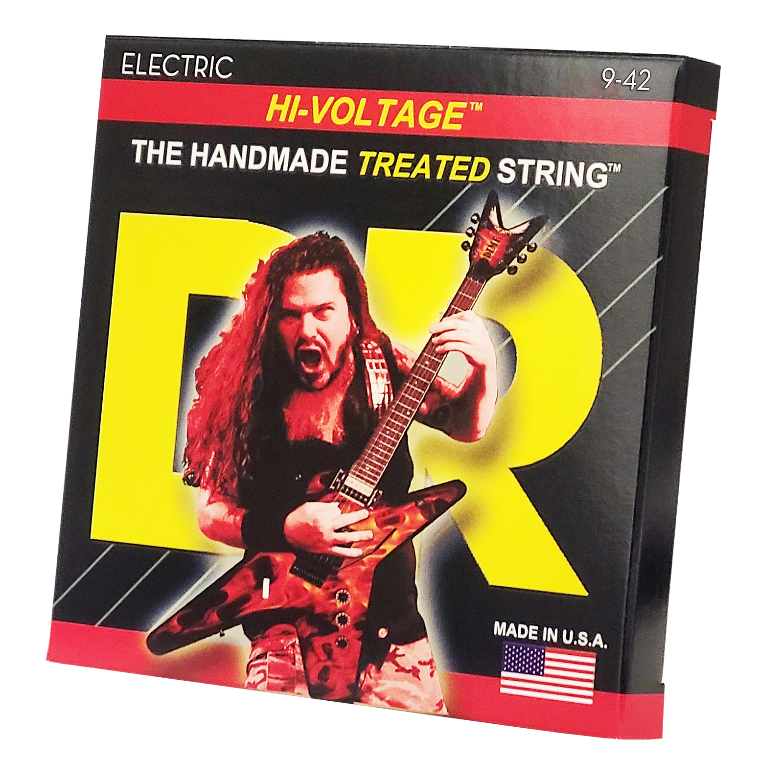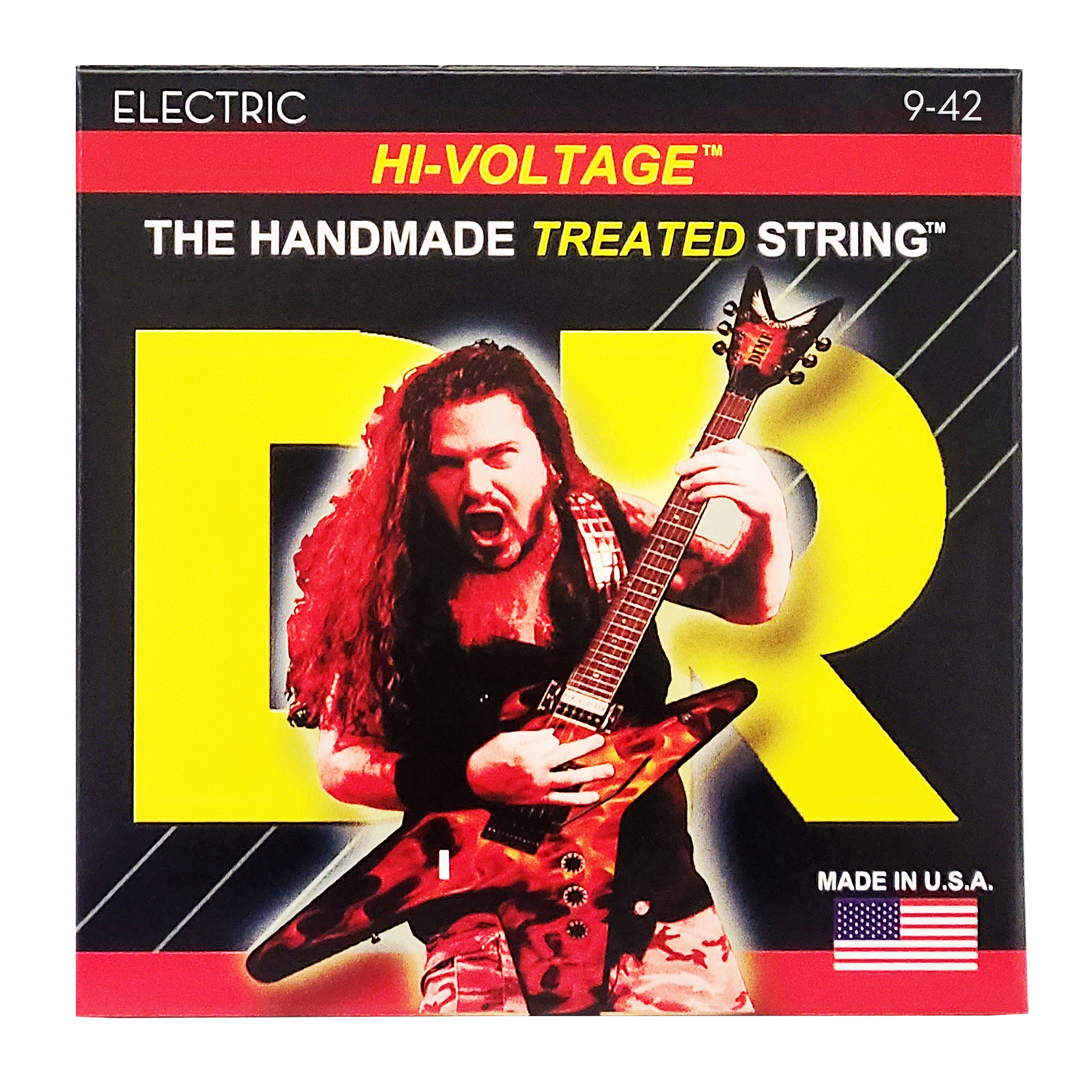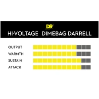 HI-VOLTAGE™ Electric Guitar Strings are the signature strings played by the late metal icon Dimebag Darrell.  They feature a hexagonal core wire and nickel-plated steel wrap wire treated with a liquid polymer that protects them from corrosive elements.  As Dime used to say, "They're great for everything, from big ol' string bends, to huge whammy bar dives, perfect for blood curdling harmonic screams and just straight out heavy chucky riffin'."
