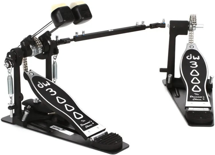 The DW Double Bass Drum Pedal DWCP3002 3000 Series is the perfect double kick pedal for those players looking for a high quality double chain drive pedal without breaking the bank!! Here's a double kick drum pedal that's perfect for any drummer. DW's 3000-series pedals combine rock-solid reliability with an incredibly affordable price tag. If your style calls for a the thunderous sound of a double kick, then put the DW DWCP3002 double kick drum pedal at the top of your list. You're going to love the feel of this pedal. Dual-chain turbo drive and a bearing Spring rocker assembly give the DWCP3002 the kind of response and recovery you demand, and you can count on its heavy-duty all-metal construction, night after night. You'll also appreciate the single-post design of the DWCP3002's hat-side pedal, which lets you position it closer to the hi-hat than a typical double kick pedal. Add to that DW's 101 2-way beater, and you know you'll get the sound and feel that you need from the DWCP3002!